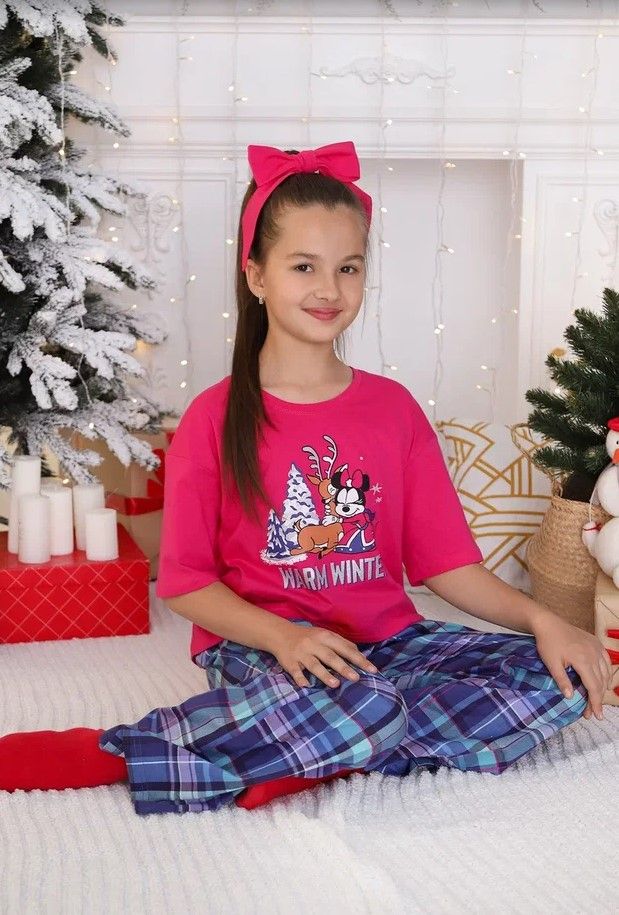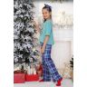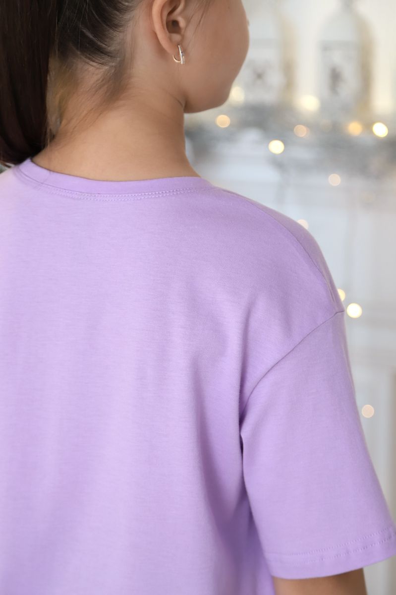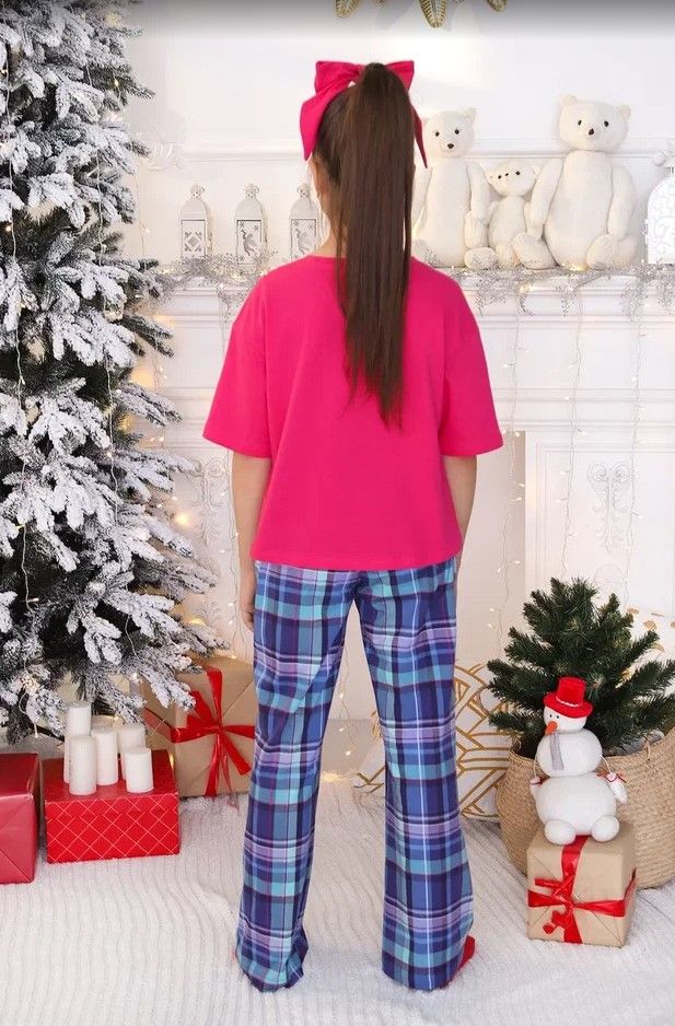 Костюм для девочки из трикотажного полотна "кулирка", состоящий из футболки и брюк. Футболка - из гладкокрашеного полотна, модного слегка расширенного силуэта и укороченная по длине, с втачными короткими рукавами, горловиной овальной формы, обработанной втачной планкой и принтом на полочке, выполненным методом шелкографии. Брюки - из полотна в клетку, широкие, прямые, на притачном поясе с эластичной тесьмой внутри и карманами в боковых швах .