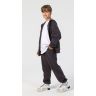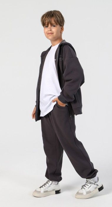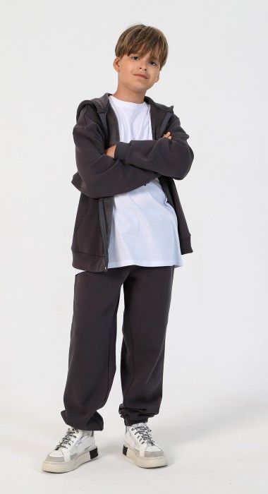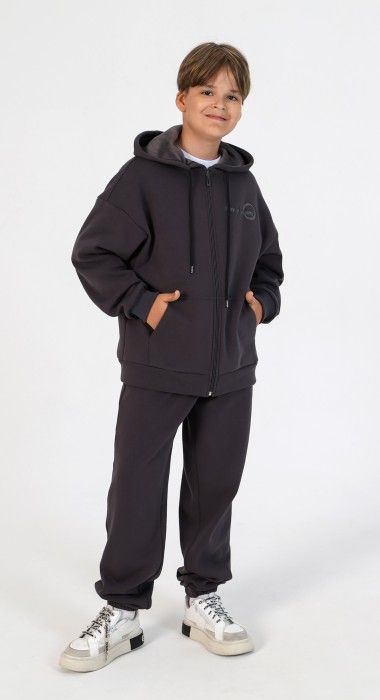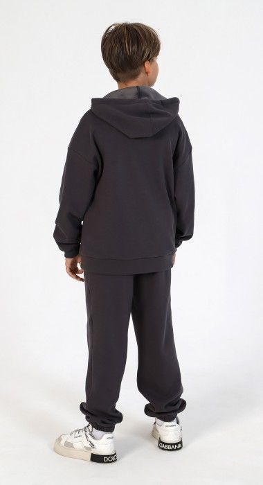 Костюм для мальчика состоит из толстовки и брюк. Толстовка - с капюшоном, втачными рукавами, карманами "кенгуру" на полочках, притачным поясом по низу и центральной бортовой застежкой на тесьму "молния". Рукава - с притачными манжетами. Передний край капюшона - с двумя люверсами, через которые продет шнурок с наконечниками. Брюки - длинные, на притачном поясе с эластичной тесьмой внутри и карманами в боковых швах. Нижние срезы обработаны с эластичной тесьмой.
