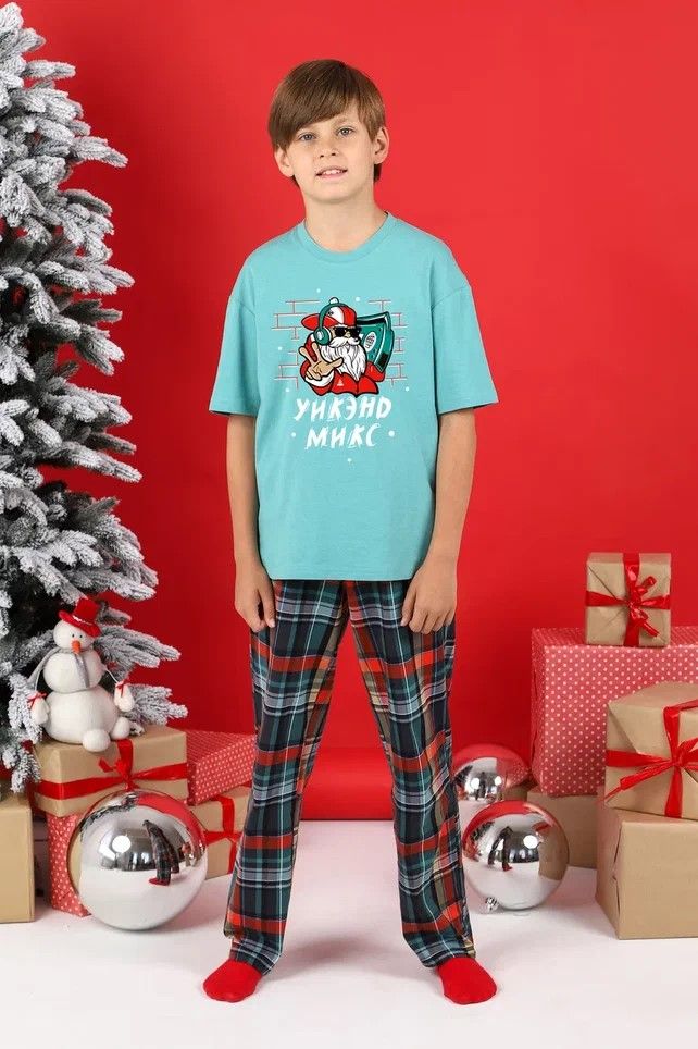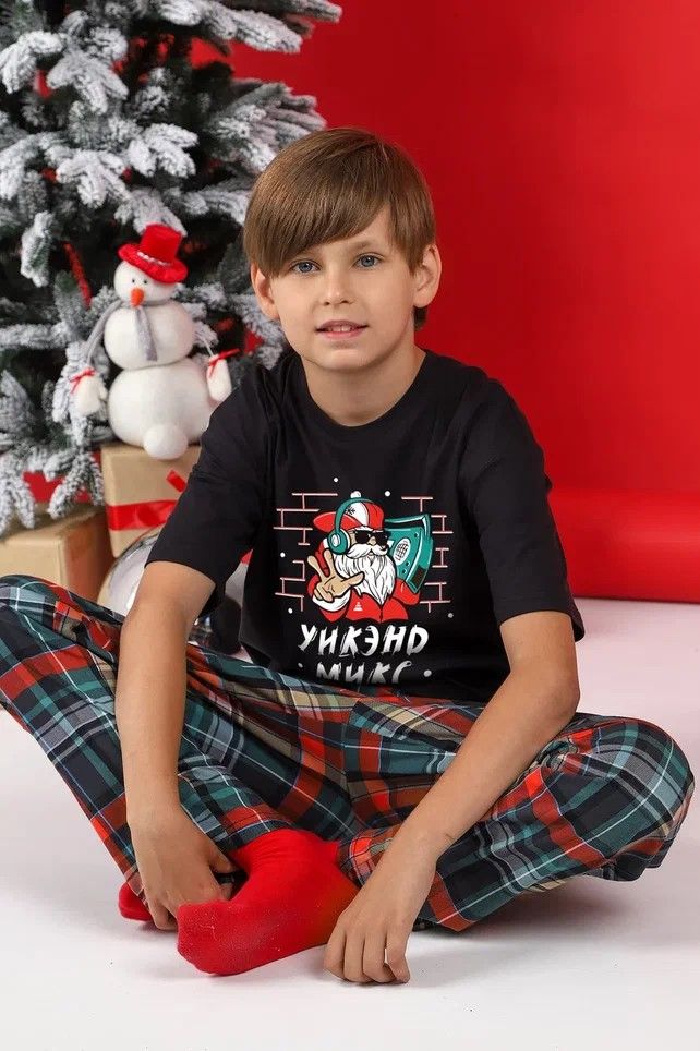 Костюм для мальчика из трикотажного полотна "кулирка", состоящий из футболки и брюк.