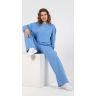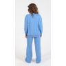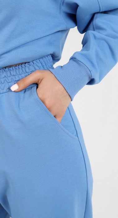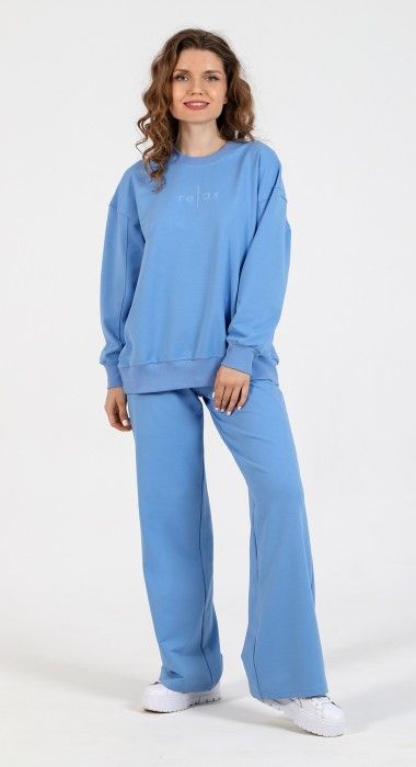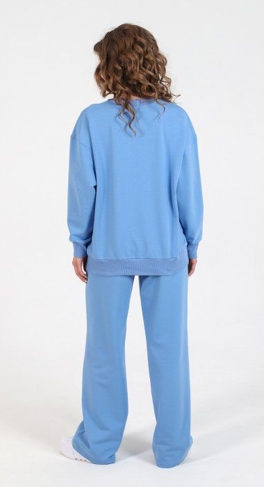 Костюм из гладкокрашеного трикотажного полотна «футер-двунитка», состоящий из джемпера и брюк. Джемпер - прямого силуэта, с длинными втачными рукавами, горловиной овальной формы, обработанной втачной планкой, притачным поясом и принтом на полочке, выполненным методом шелкографии. Манжеты рукавов, планка горловины и полупояса по низу изделия выполнены из эластичного полотна «рибана» в тон основному материалу, боковые швы смещены в сторону переда. Брюки – длинные слегка расширенные книзу, на притачном поясе с эластичной тесьмой внутри и карманами в боковых швах.