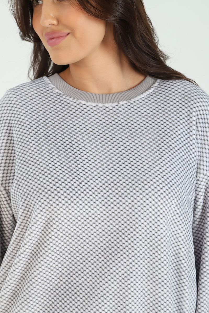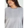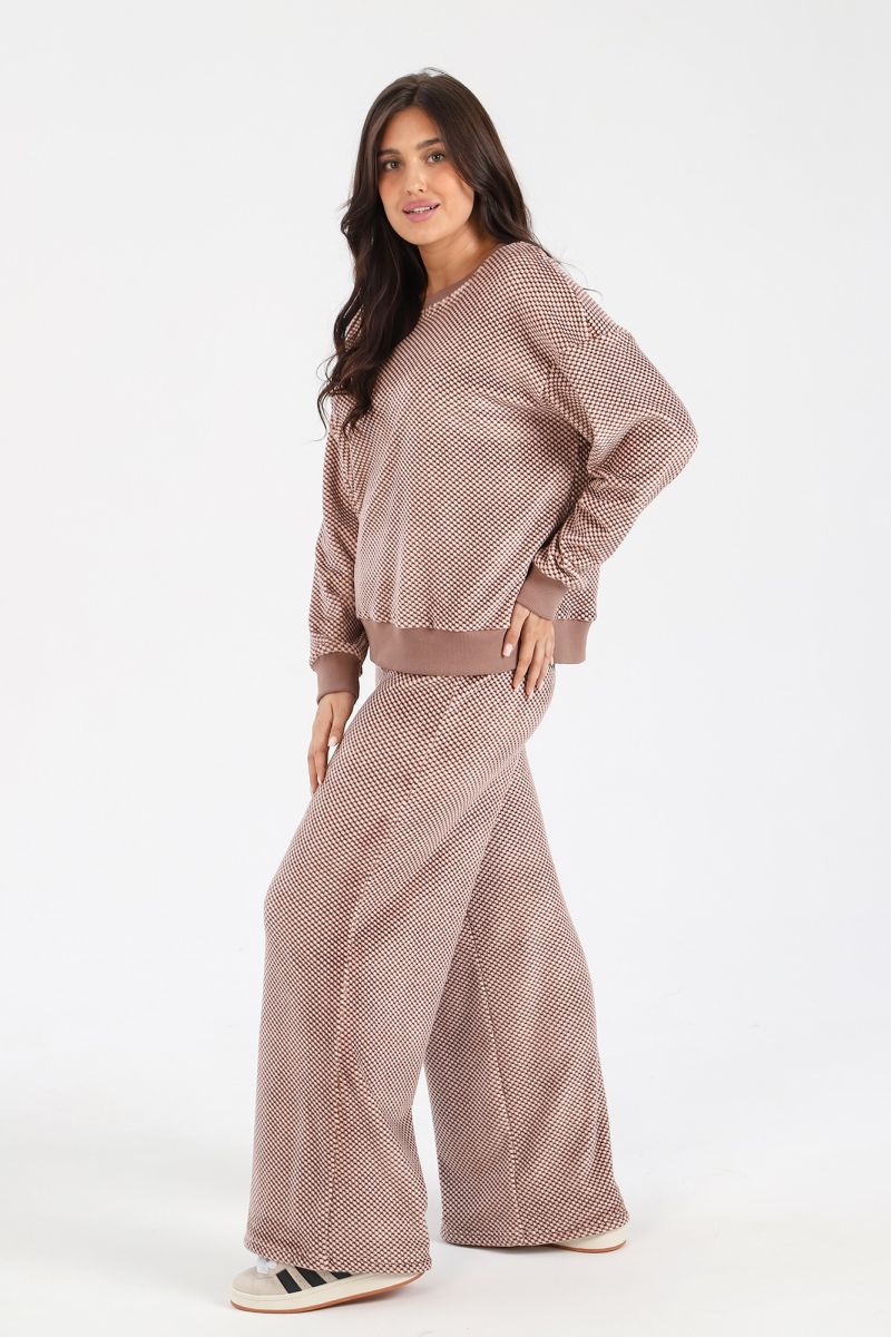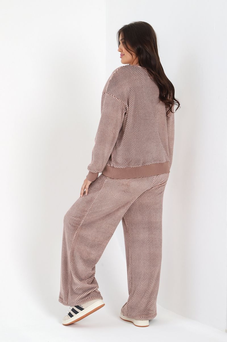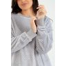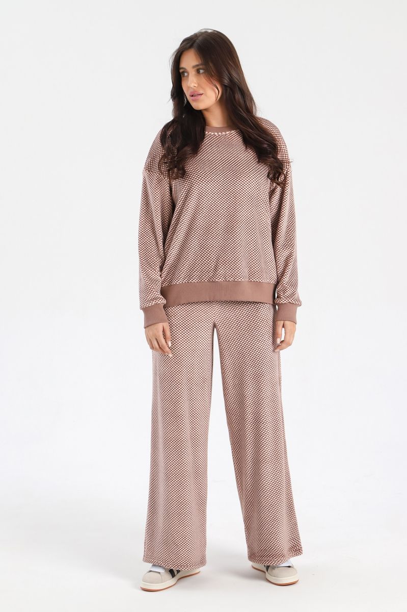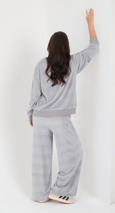 Костюм молодежный из трикотажного полотна «суперсофт» состоящий из джемпера и брюк. Джемпер – из набивного полотна, с длинными втачными рукавами, горловиной овальной формы, обработанной втачной планкой. Планка горловины, манжеты рукавов и притачной пояс из однотонного трикотажного полотна «кашкорсе». Брюки – из набивного полотна длинные, прямые, с эластичной тесьмой по линии талии.