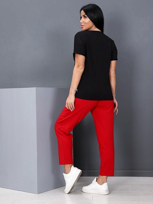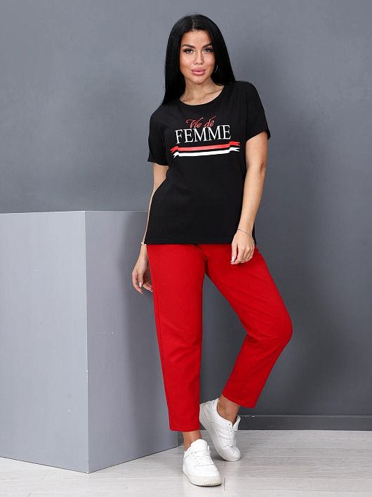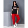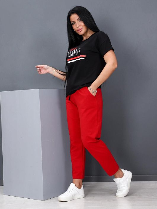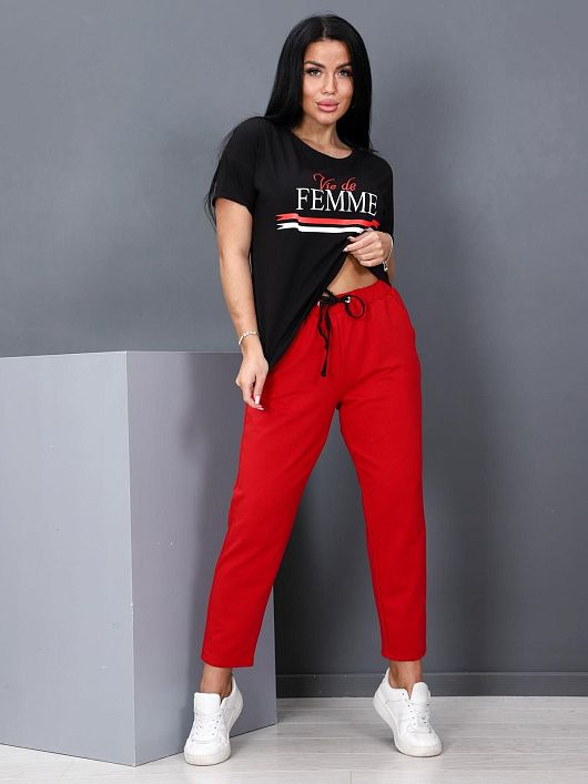 Костюм состоит из футболки и брюк. Футболка прямого силуэта со спущенной линией плеча и круглым вырезом горловины. По центру полочки яркий принт. Брюки длиной 7/8, верх на эластичной тесьме, в боковых швах карманы.