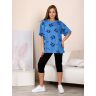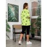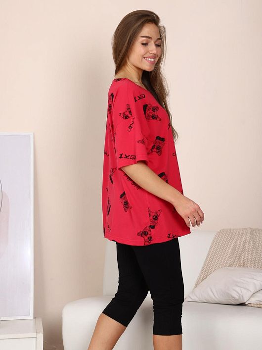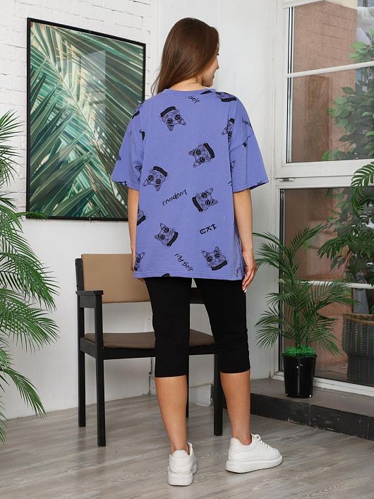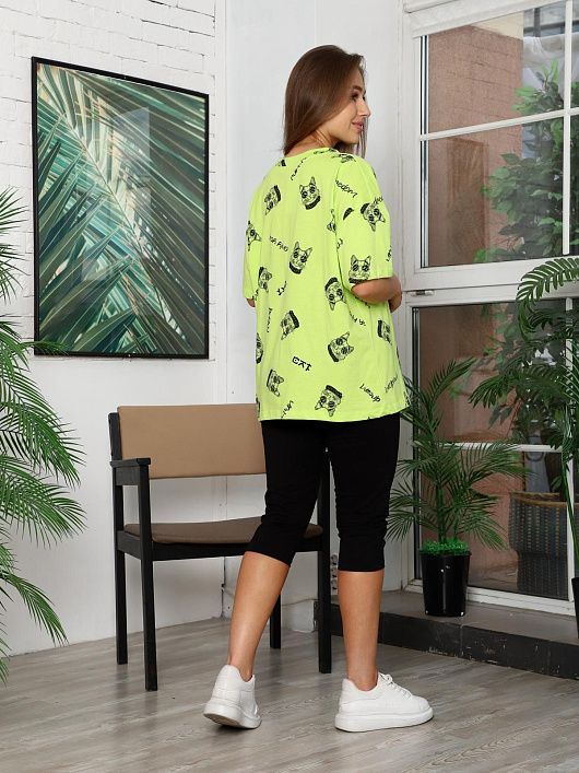 Костюм состоит из футболки и леггинсов. Футболка женская оверсайз, удлиненная. Леггинсы длиной до колен с удобным эластичным поясом.