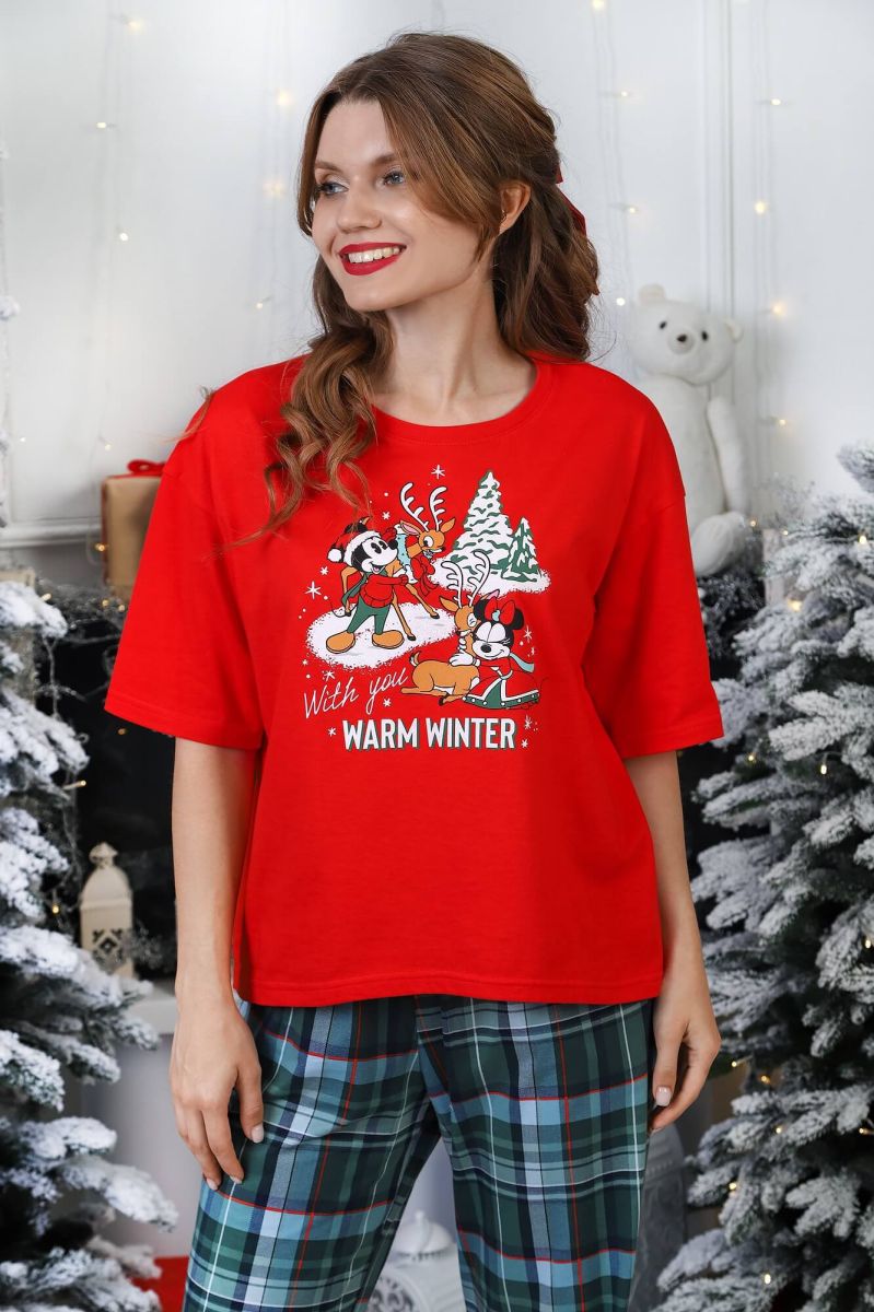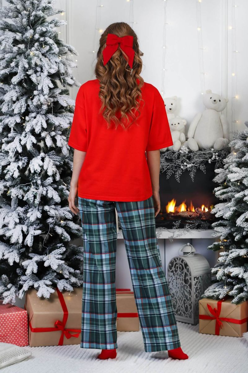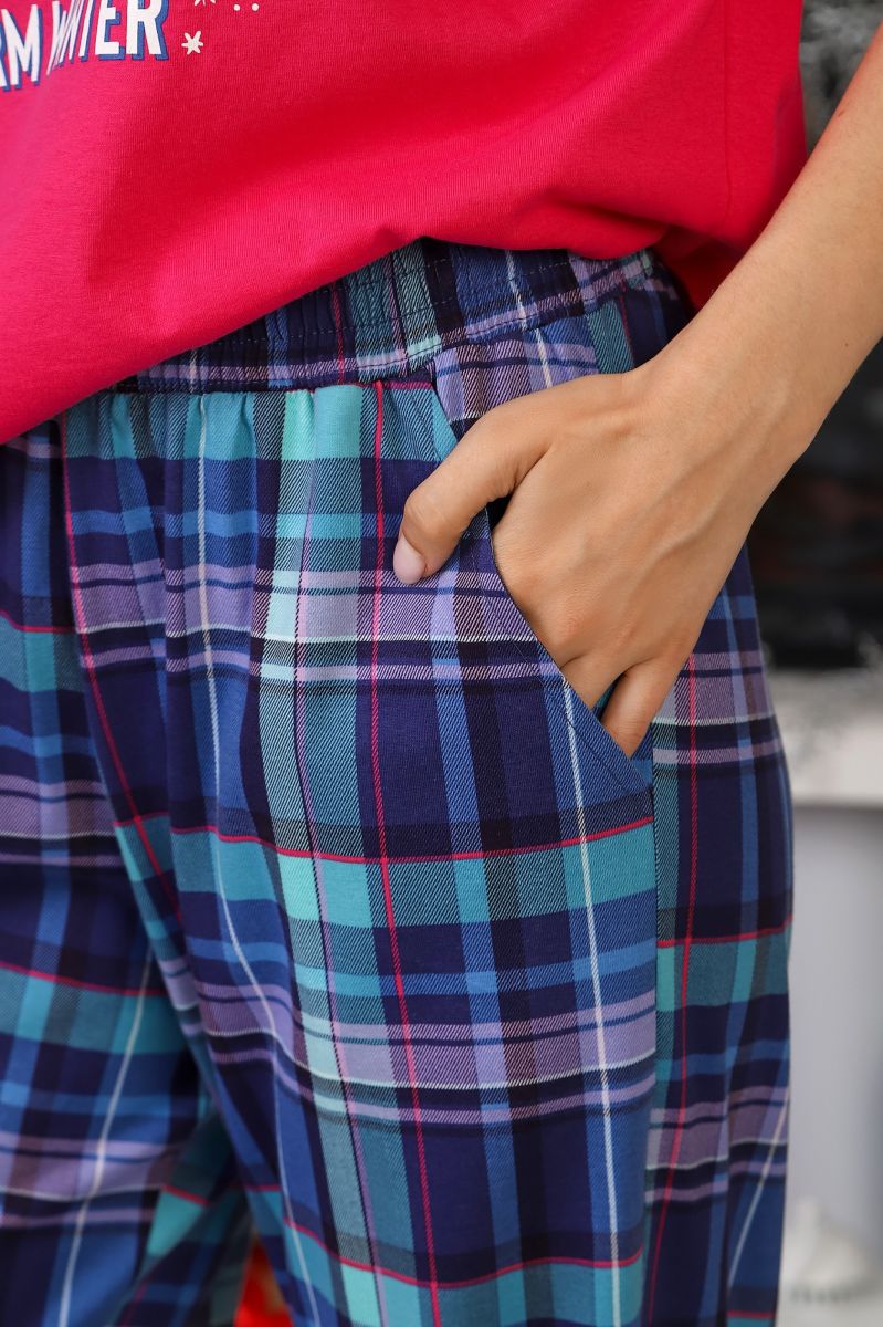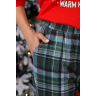 Брюки - из полотна с набивным рисунком, длинные, слегка расширенные книзу, с карманами в боковых швах, на притачном поясе с эластичной тесьмой внутри.