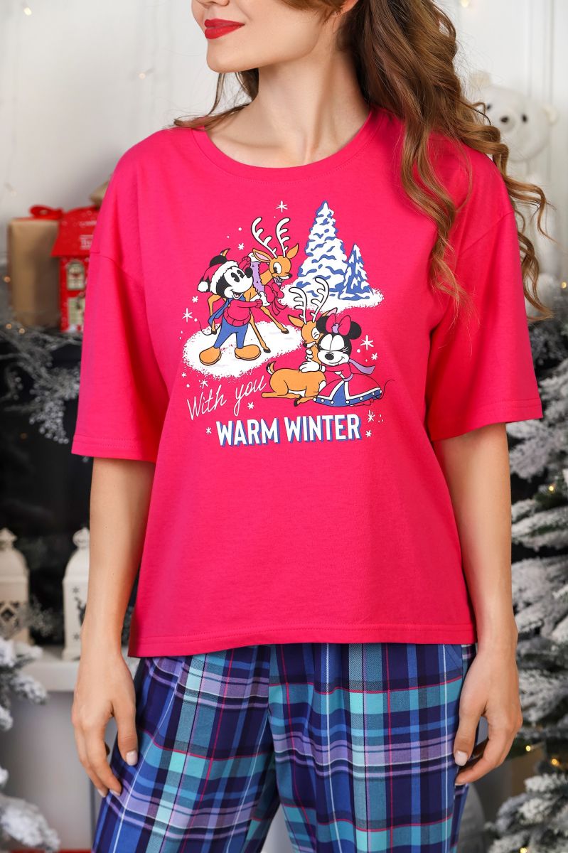Костюм молодежный из трикотажного полотна «кулирка» в комбинации двух видов: с набивным рисунком и гладкокрашенного в единой цветовой гамме, состоящий из футболки и брюк.