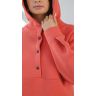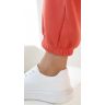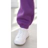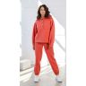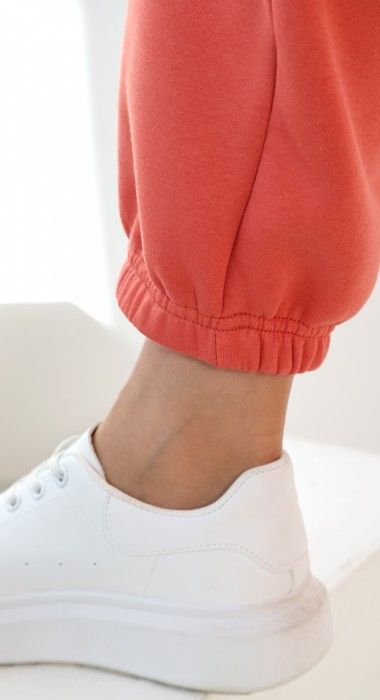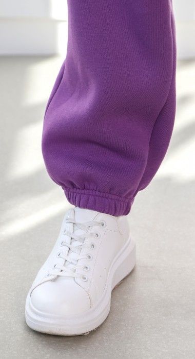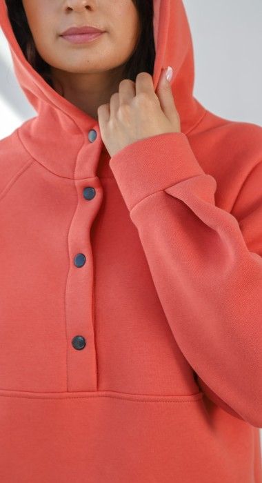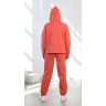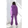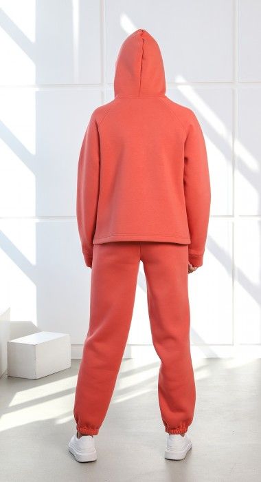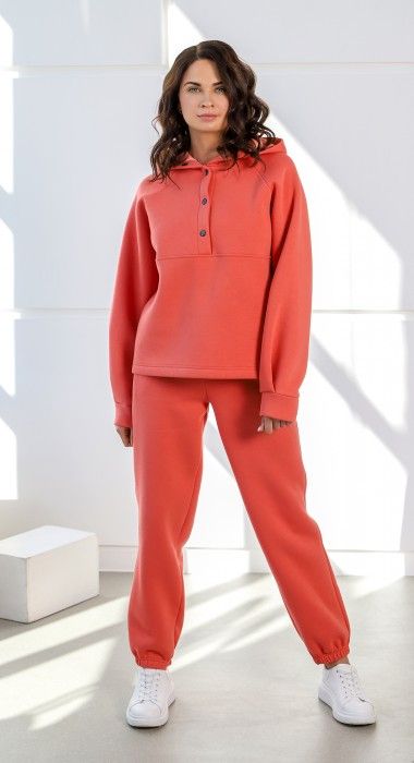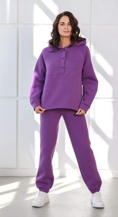 Костюм женский из футера с начесом. Джемпер с застежкой на кнопки в верхней части, с капюшоном на подкладке, рукавами покроя "реглан", со складками и манжетами по низу рукавов. Брюки, собранные по низу на резиновую тесьму, на притачном поясе с отстроченной эластичной тесьмой и внутренним шнуром, с карманами в боковых швах. Примерание: Дизайн вшивного декоративного элемента по низу бокового шва джемпера вариативен.