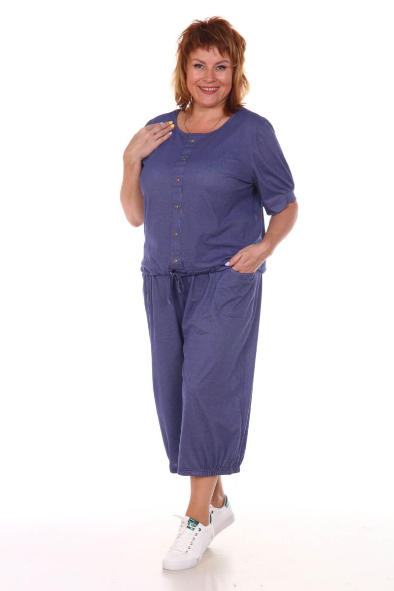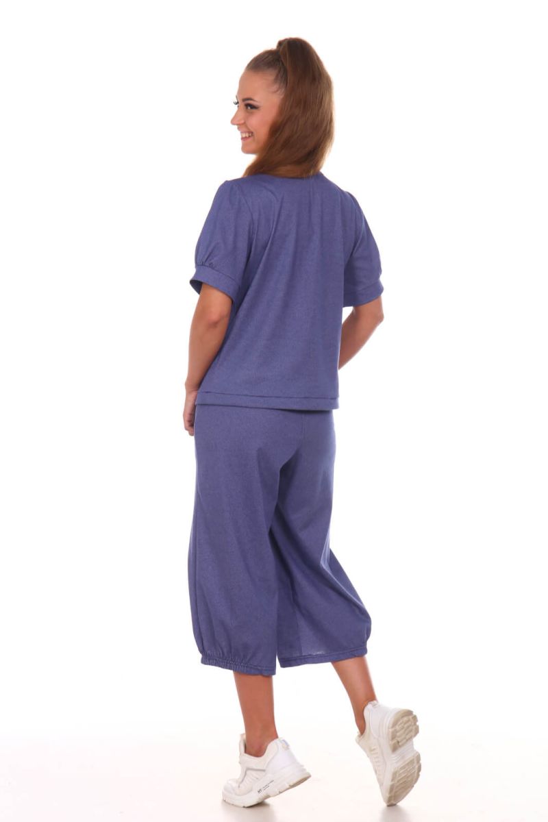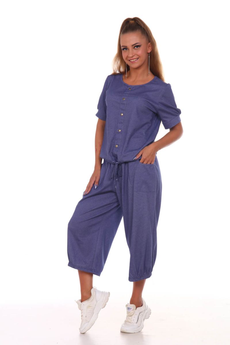 Женский костюм выполнен из полотна "кулирка". Модные в этом сезоне широкие брюки кюлоты, длиной до середины икры, с карманами, поясом на эластичной тесьме. Ширина брючин по низу присобрана на резинку от середины передней части до середины задней части брюк. Футболка прямого покроя с рукавами на манжетах, по переду изделия ложная планка-застежка, с установленными по ней кнопками, низ футболки собран на кулиску, горловина обработана косой бейкой.