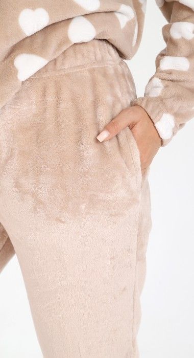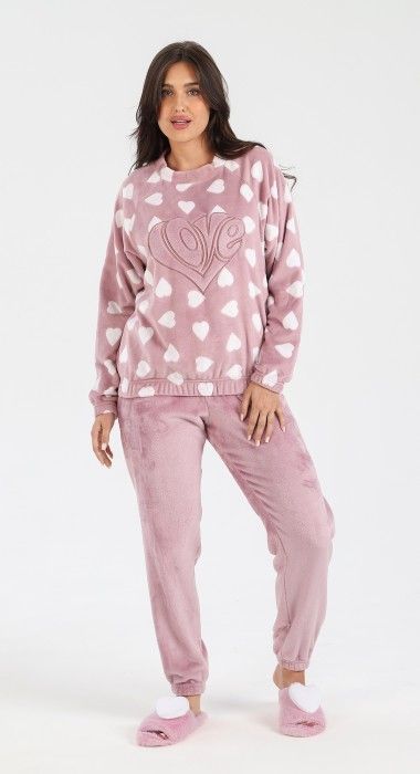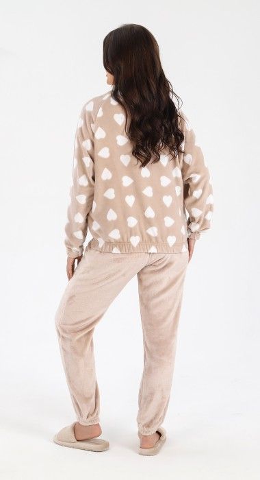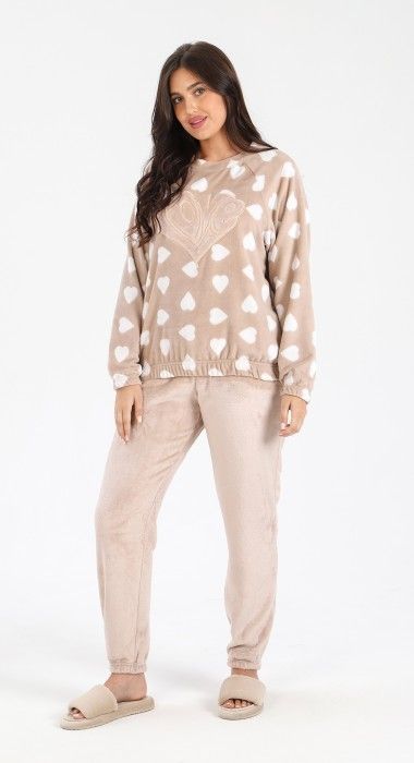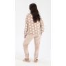 Костюм из тканого полотна «ультрасофт» в комбинации двух видов, состоящий из джемпера и брюк. Джемпер – свободного покроя с длинными рукавами «реглан», горловиной овальной формы, обработанной втачной планкой. Низ изделия и рукава обработаны эластичной тесьмой. В центре на полочке вышивка –аппликация. Брюки - из гладкокрашенного полотна, с карманами в боковых швах, с эластичной тесьмой по талии и нижним срезам.