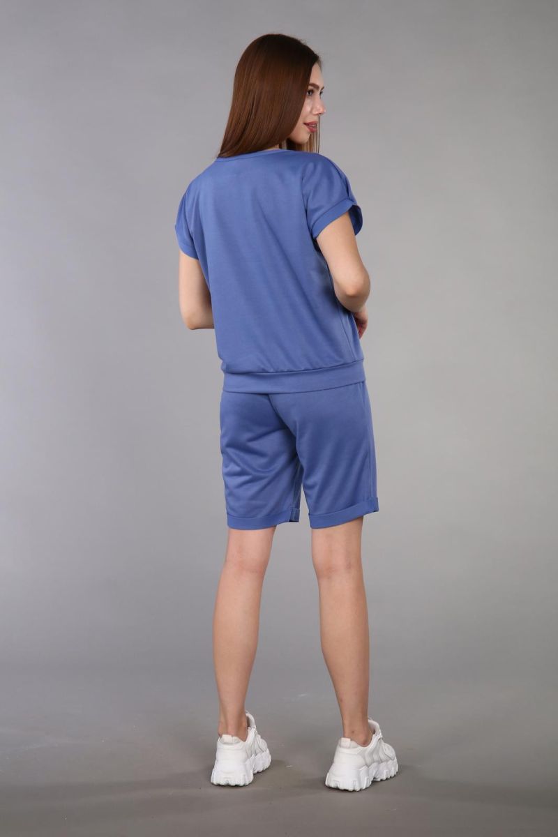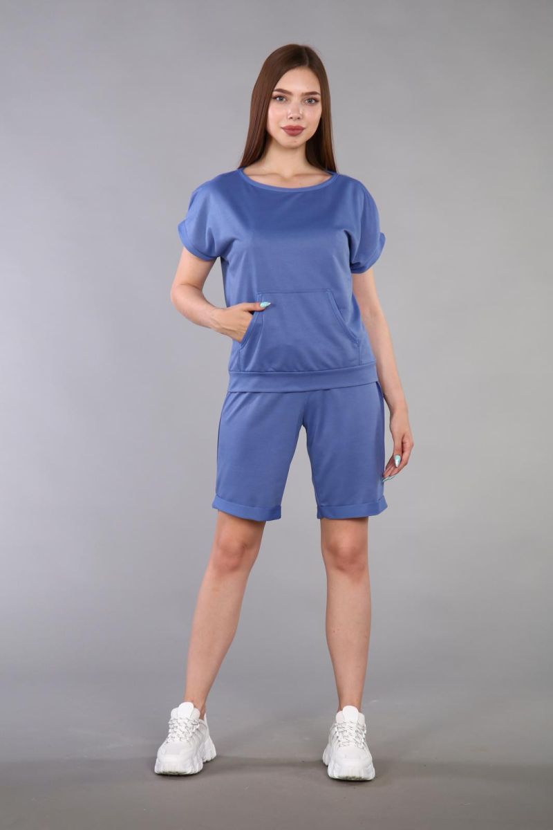 Костюм женский из футера двунитки. Кофта укороченная на притачном поясе, без рукавов со спущенным плечом, накладной карман - "кенгуру". Шорты удлиненные, пояс на резинке, по низу - отложные манжеты.