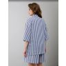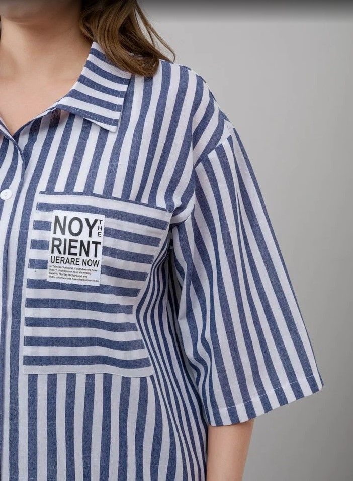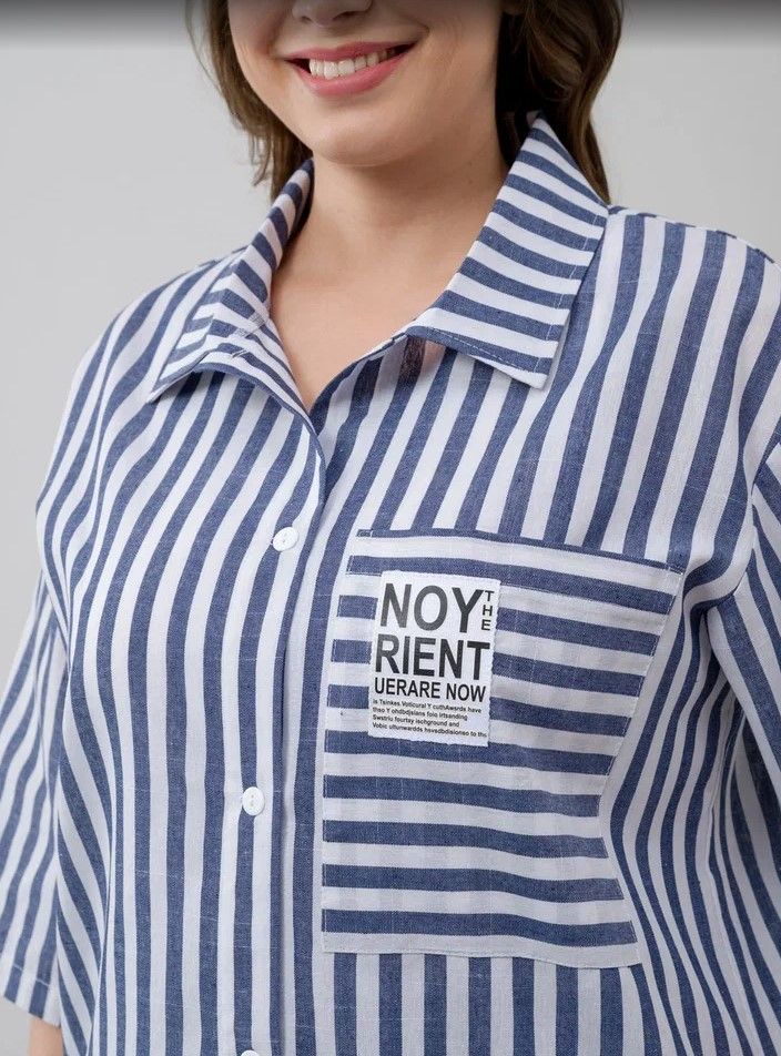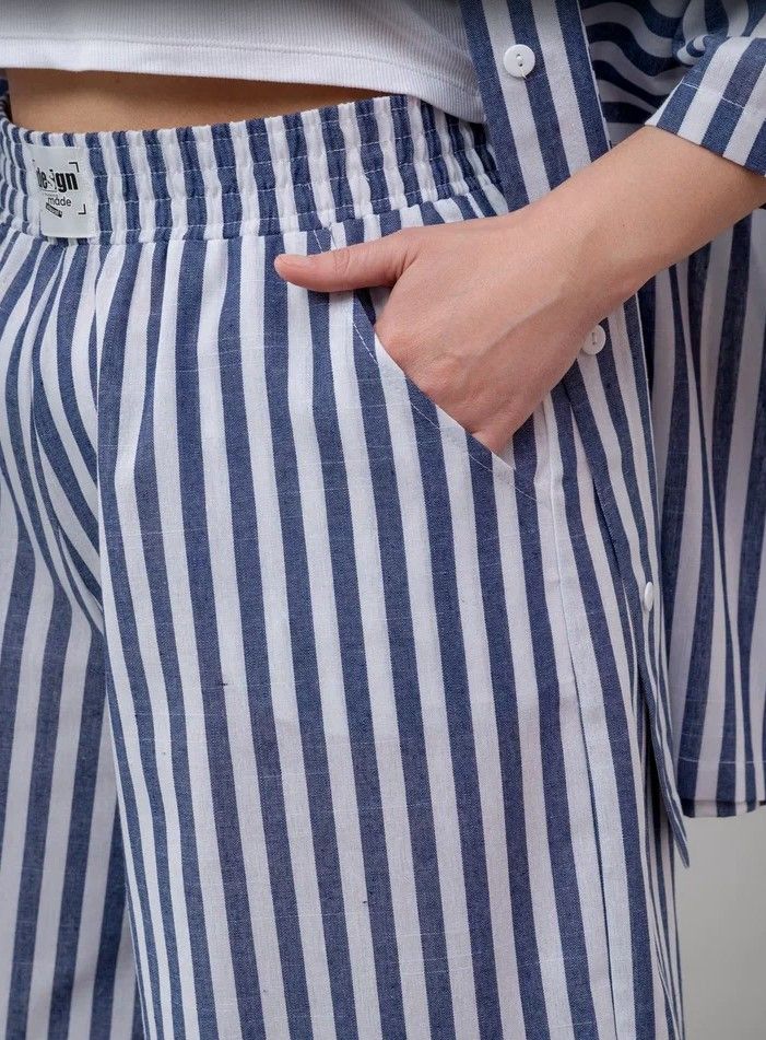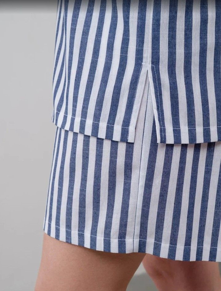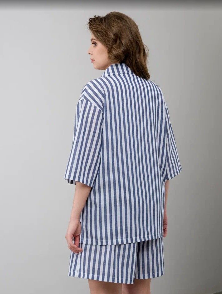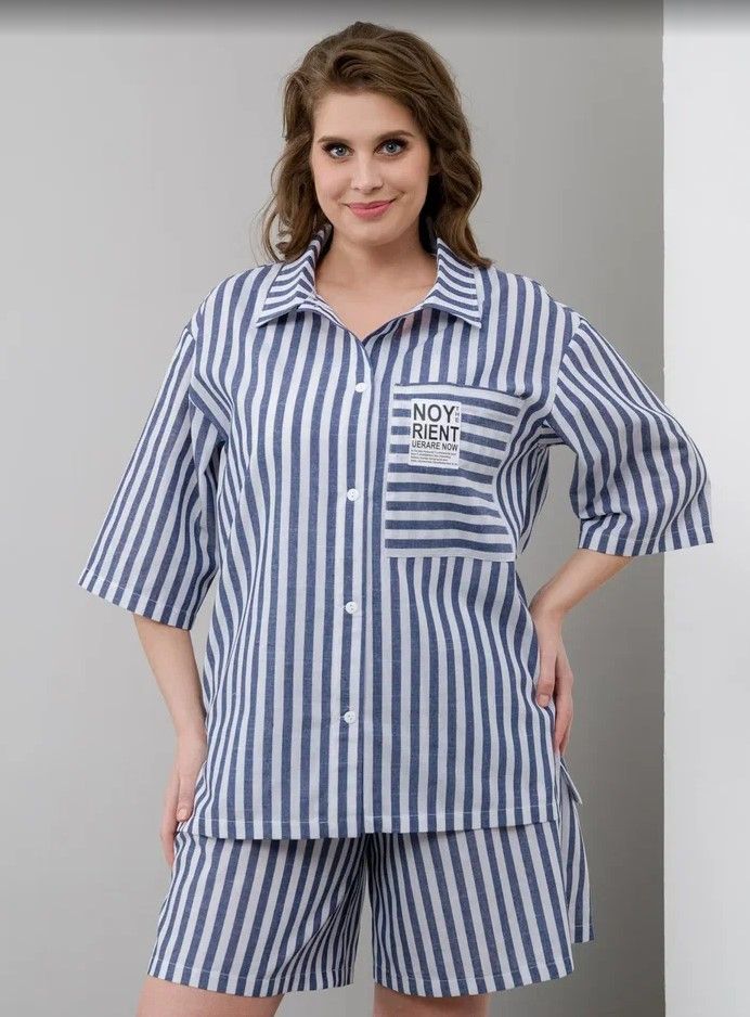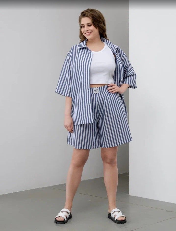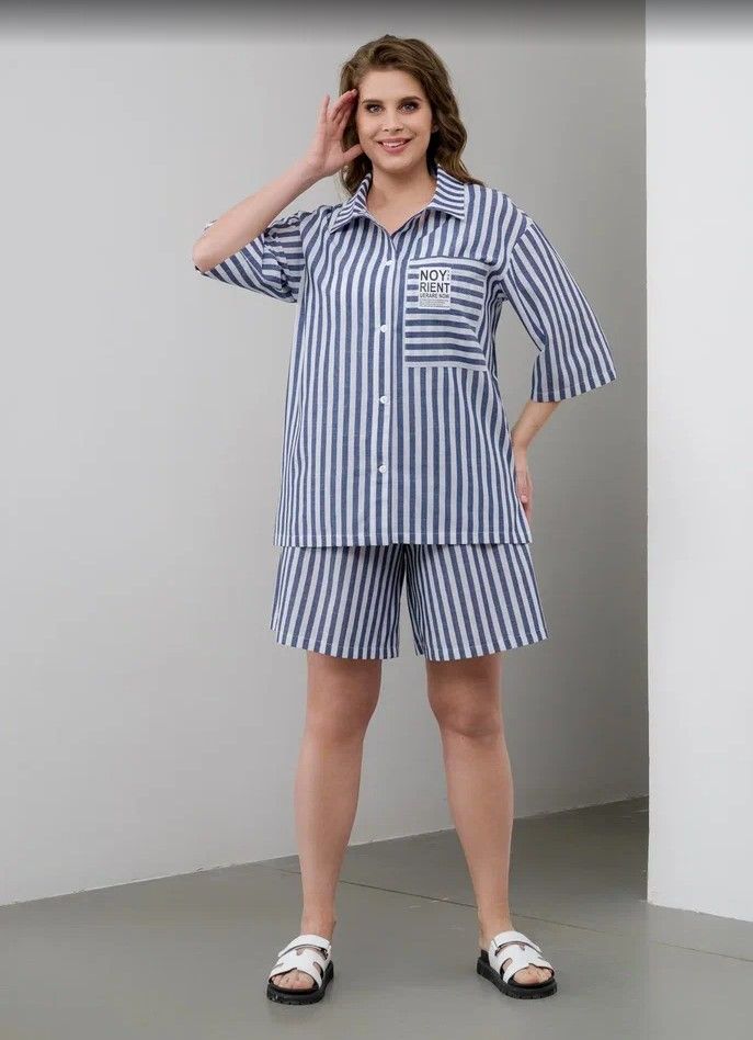Костюм женский из плательной ткани «лен» с рисунком «полоса», состоящий из блузы (рубашки) и шорт. Блуза (рубашка) женская, свободного покроя, с короткими втачными рукавами длиной до локтя, стояче-отложным воротником, центральной бортовой застежкой на обметанные петли и пуговицы. В боковых швах разрезы, на левой полочке нагрудный карман, с настроченным на него декоративным элементом.Шорты женские свободные, классического покроя, средней длины, с карманами в боковых швах, на притачном поясе с эластичной тесьмой внутри. По центру пояса настрочен декоративный элемент. Плотность ткани: 130 гр/м2