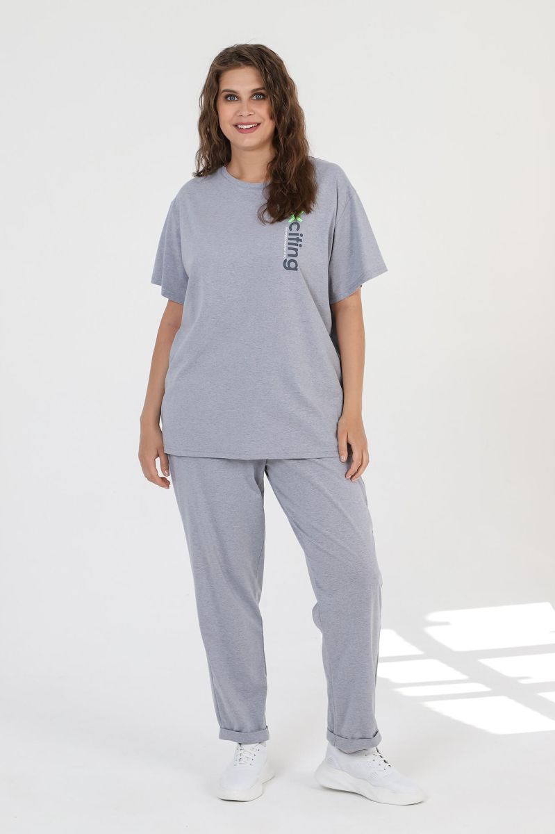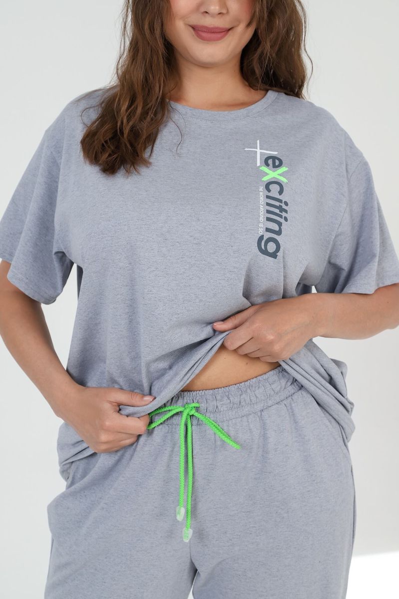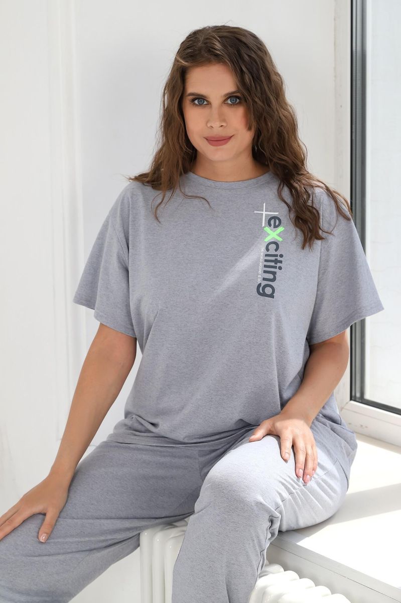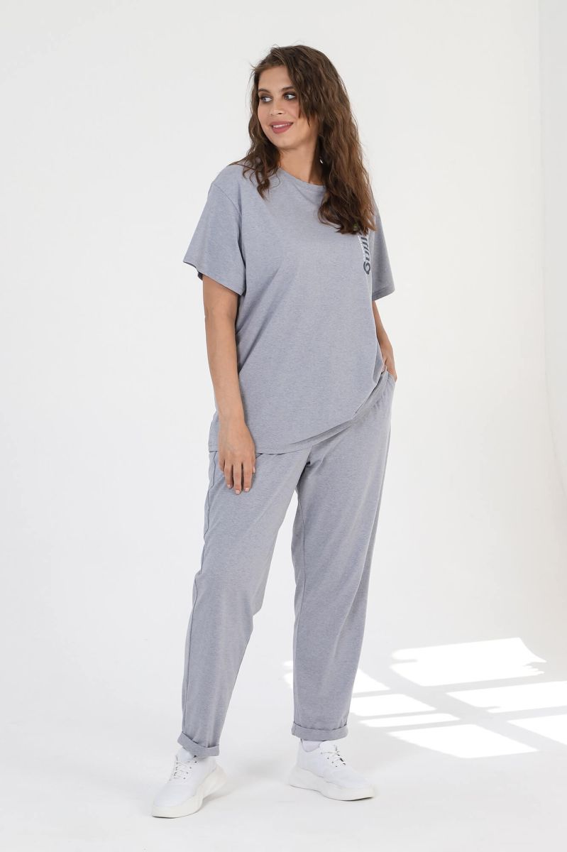 Костюм женский из трикотажного полотна «кулирка» с «меланжированным» эффектом, состоящий из футболки и брюк. Футболка - из гладкокрашенного полотна с имитацией меланжа, классического покроя, с короткими втачными рукавами, горловиной овальной формы и принтом выполненым в технике «шелкографии». Горловина обработана притачной бейкой из основного материала. Брюки - из гладкокрашенного полотна с имитацией меланжа, свободные, с карманами в боковых швах, на притачном поясе с эластичной тесьмой внутри.
