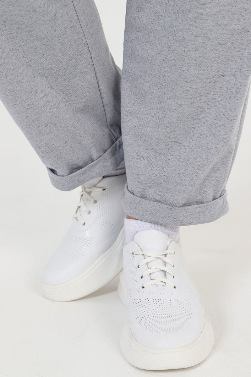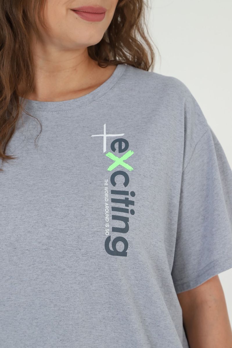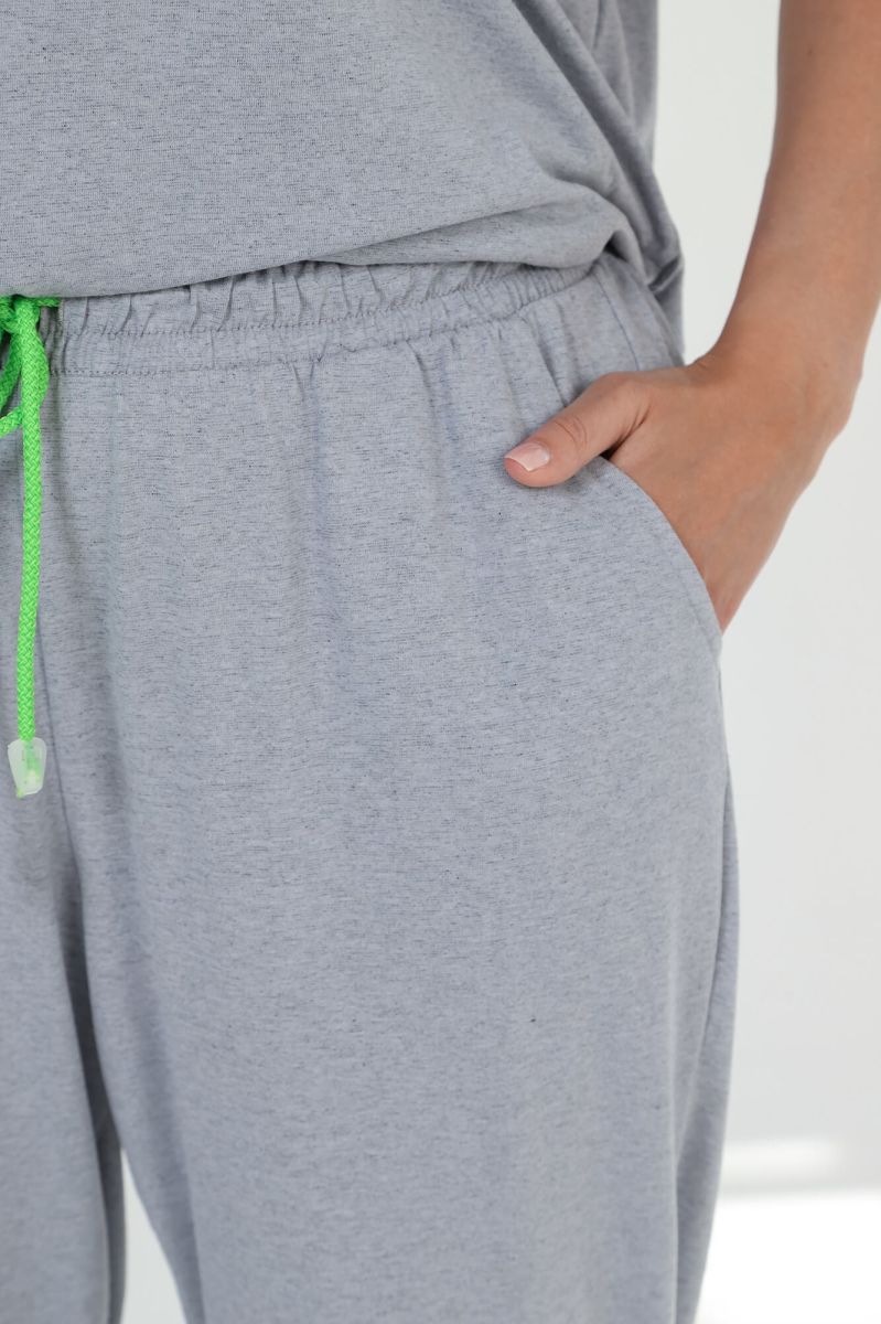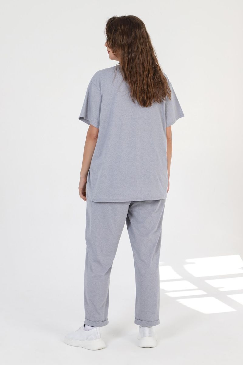 Костюм женский из трикотажного полотна «кулирка» с «меланжированным» эффектом, состоящий из футболки и брюк. Футболка - из гладкокрашенного полотна с имитацией меланжа, классического покроя, с короткими втачными рукавами, горловиной овальной формы и принтом выполненым в технике «шелкографии». Горловина обработана притачной бейкой из основного материала. Брюки - из гладкокрашенного полотна с имитацией меланжа, свободные, с карманами в боковых швах, на притачном поясе с эластичной тесьмой внутри.