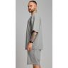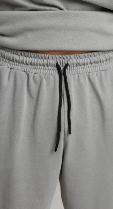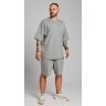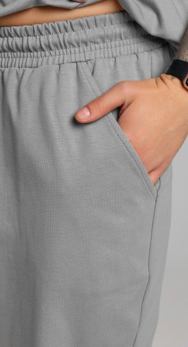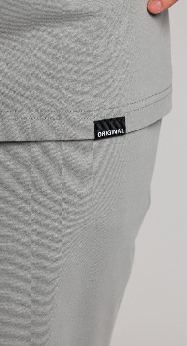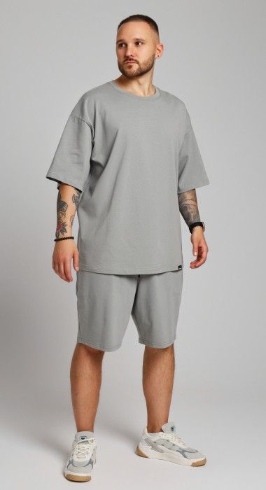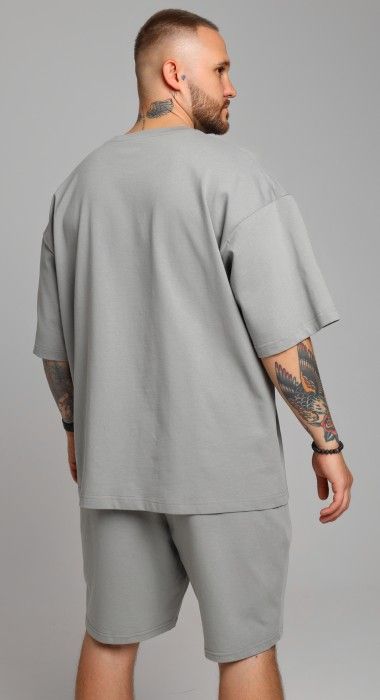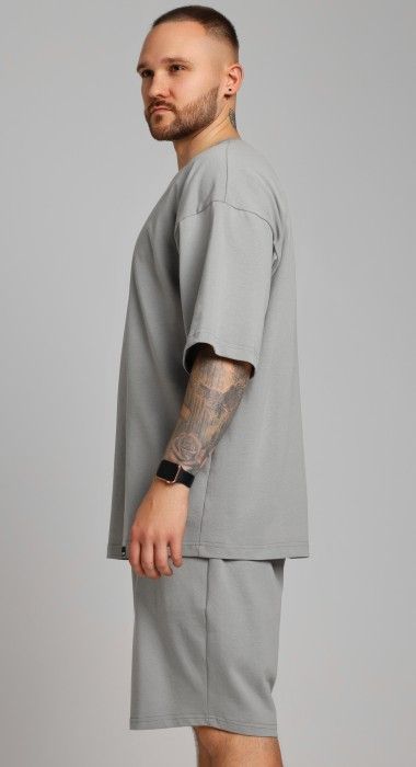 Костюм мужской из трикотажного полотна повышенной плотности, состоящий из футболки и шорт. Футболка - свободного покроя, со спущенным плечом, втачными рукавами длиной до локтя, с горловиной овальной формы, обработанной втачной планкой и отделочной строчкой по шву втачивания планки. Шорты - средней длины, на притачном поясе с эластичной тесьмой внутри, с карманами в боковых швах. Пояс - с двумя обметанными петлями по центру, в которые вдет шнурок с наконечниками для регулирования степени прилегания изделия по талии.