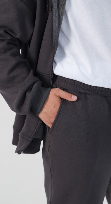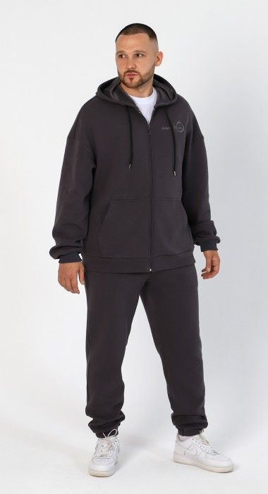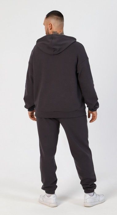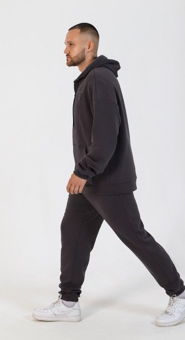 Костюм мужской состоит из толстовки и брюк. Толстовка - с капюшоном, втачными рукавами, карманами "кенгуру" на полочках, притачным поясом по низу и центральной бортовой застежкой на тесьму "молния". Рукава - с притачными манжетами. Передний край капюшона - с двумя люверсами, через которые продет шнурок с наконечниками. Брюки - длинные, на притачном поясе с эластичной тесьмой внутри и карманами в боковых швах. Нижние срезы обработаны с эластичной тесьмой.