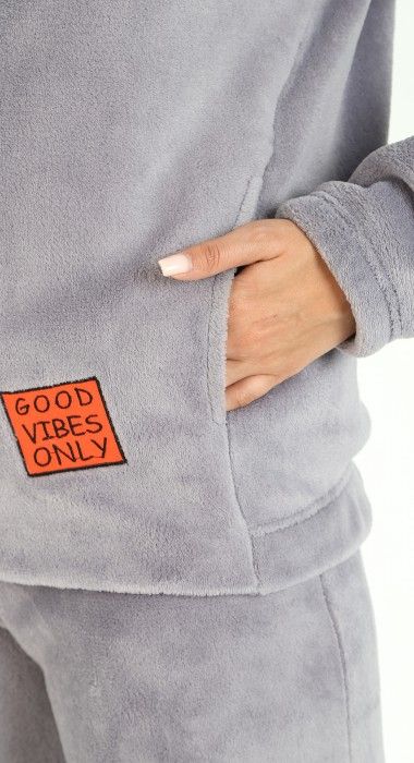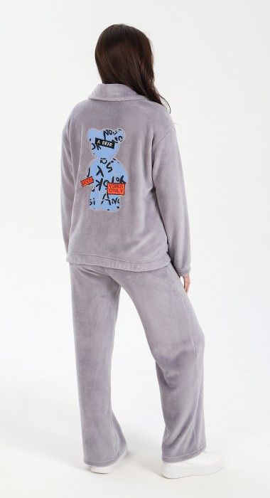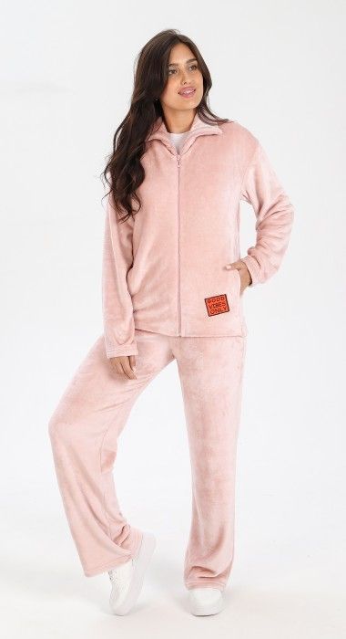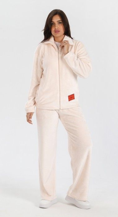 Костюм молодежный из гладкокрашенного трикотажного полотна «велсофт» состоящий из куртки и брюк. Куртка – из полотна «велсофт», с длинными втачными рукавами, воротником «стойка», карманами в боковых швах, вышивкой на спинке и в нижней части левой полочки, с центральной бортовой застежкой на тесьму «молния». Боковые швы смещены в сторону переда, подгибка низа спинки выполнена с эластичной тесьмой. Брюки – из трикотажного полотна «велсофт», длинные, слегка расширенные книзу, с эластичной тесьмой по талии.