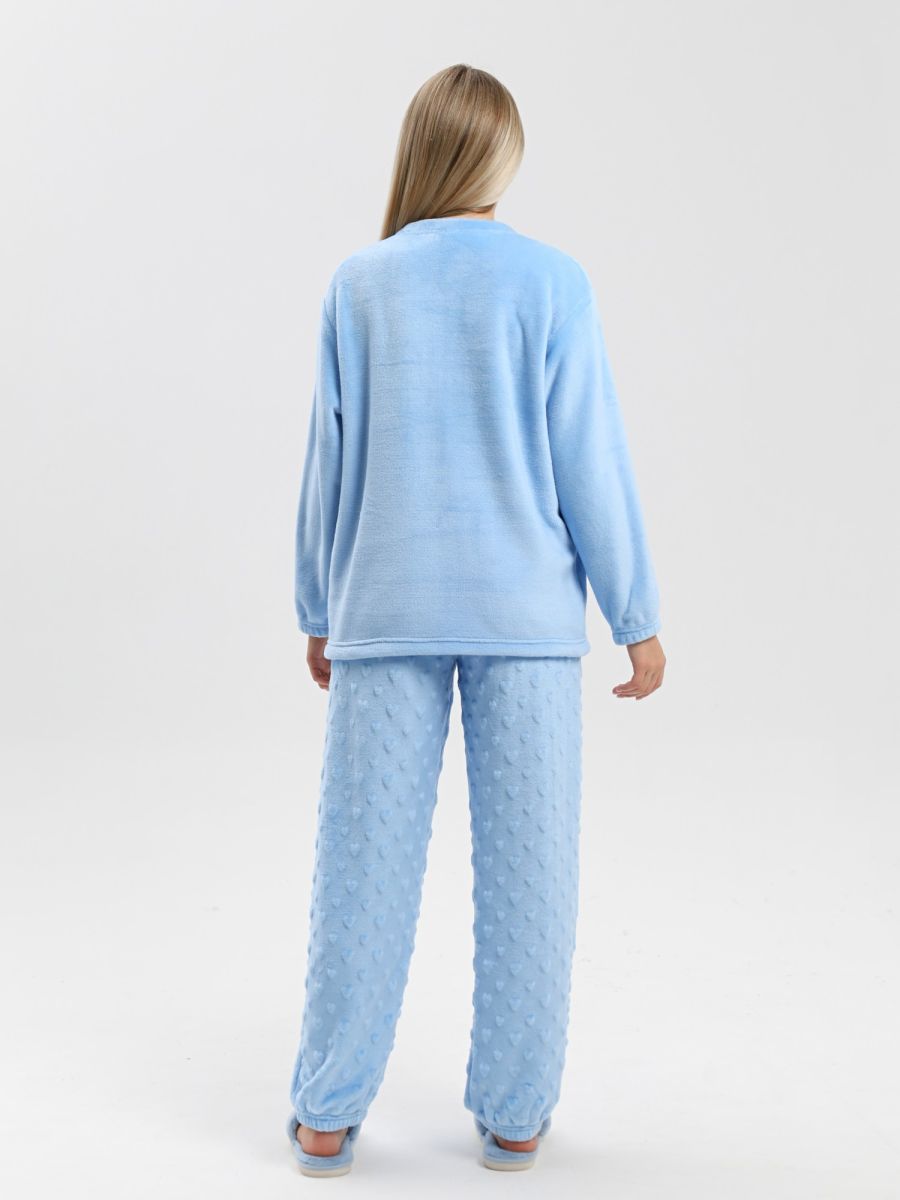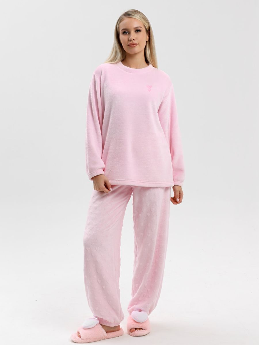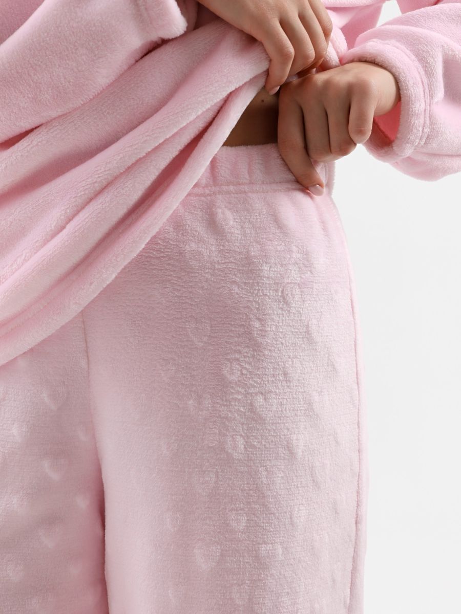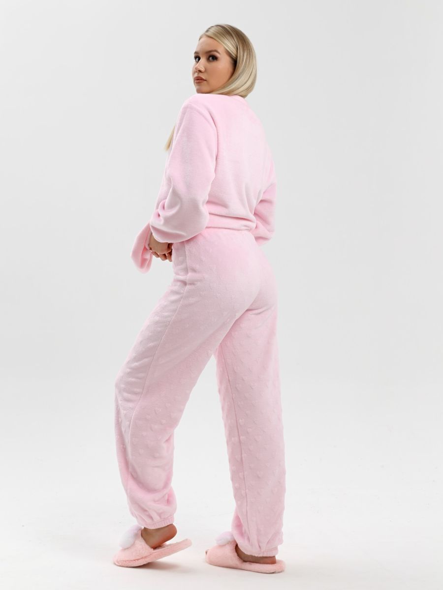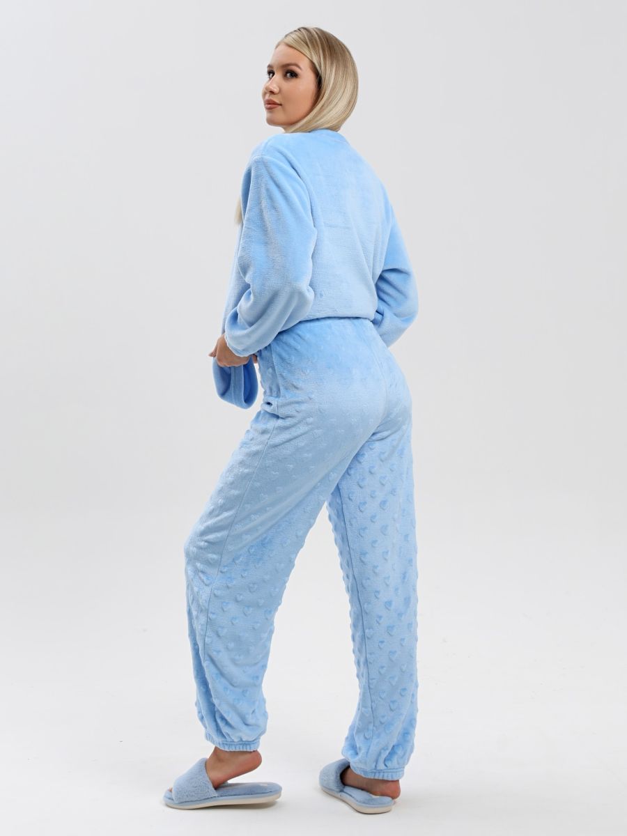 Костюм молодежный из трикотажного полотна «велсофт» в комбинации двух видов, состоящий из джемпера и брюк. Джемпер – из гладкого полотна, свободного покроя, с длинными втачными рукавами, нижние срезы которых обработаны эластичной тесьмой,и горловиной овальной формы, обработанной втачной планкой. С левой стороны на полочке вышивка.Брюки - из полотна со стриженым узором «сердечки», без карманов, с эластичной тесьмой по талии и нижним срезам.