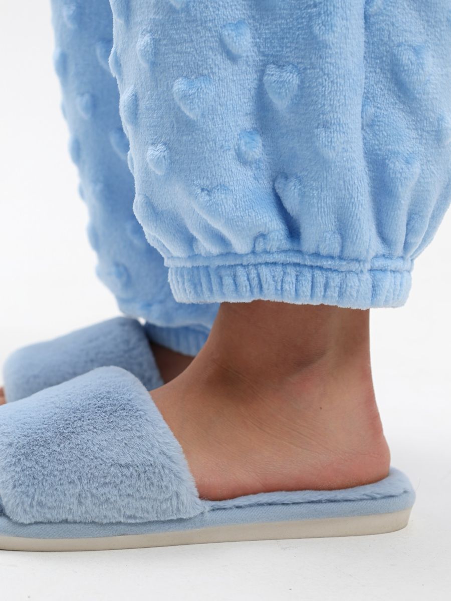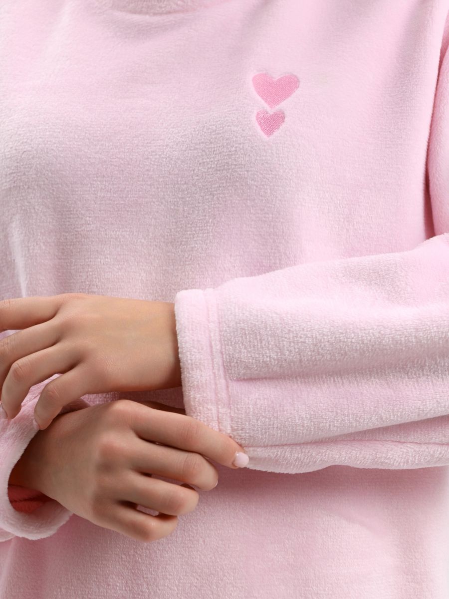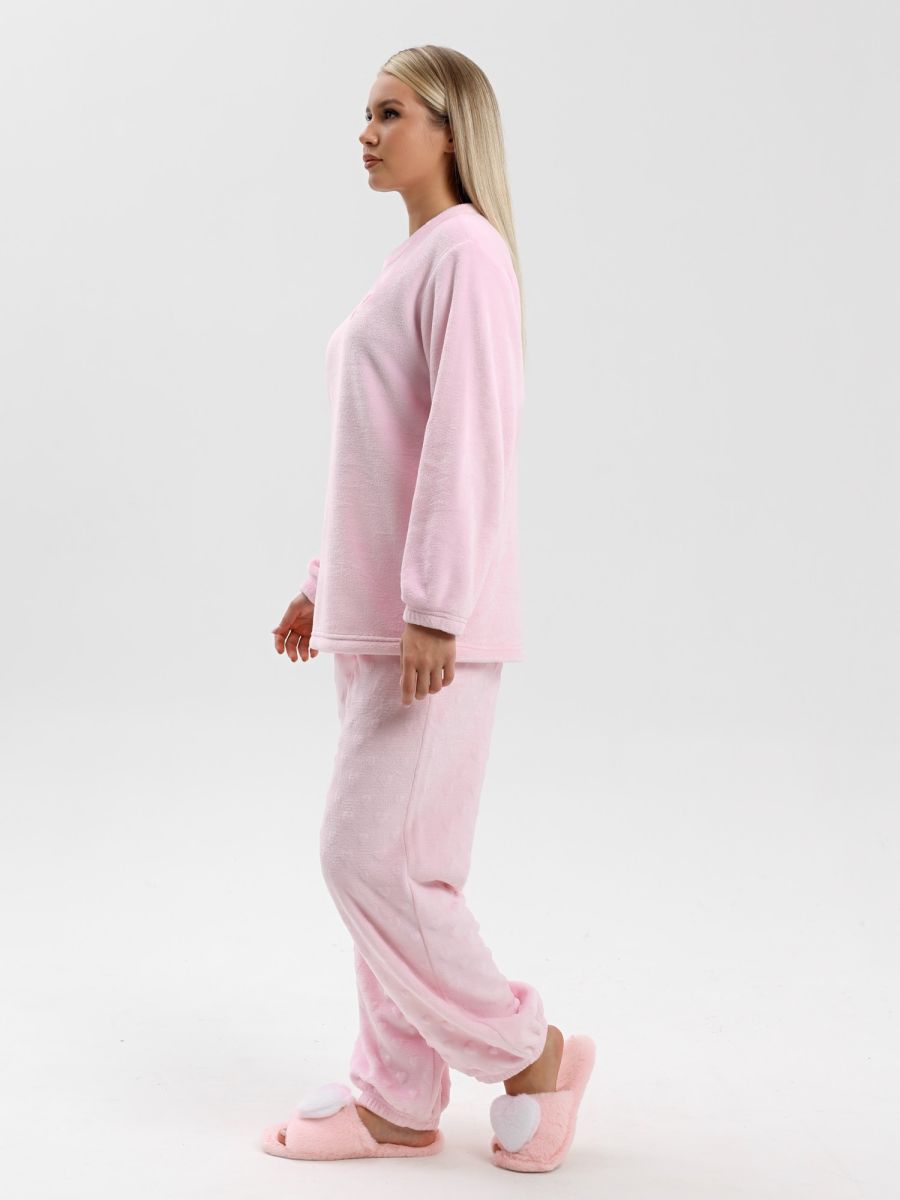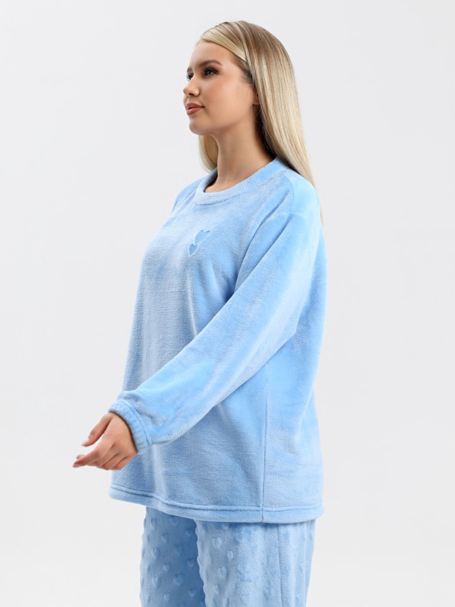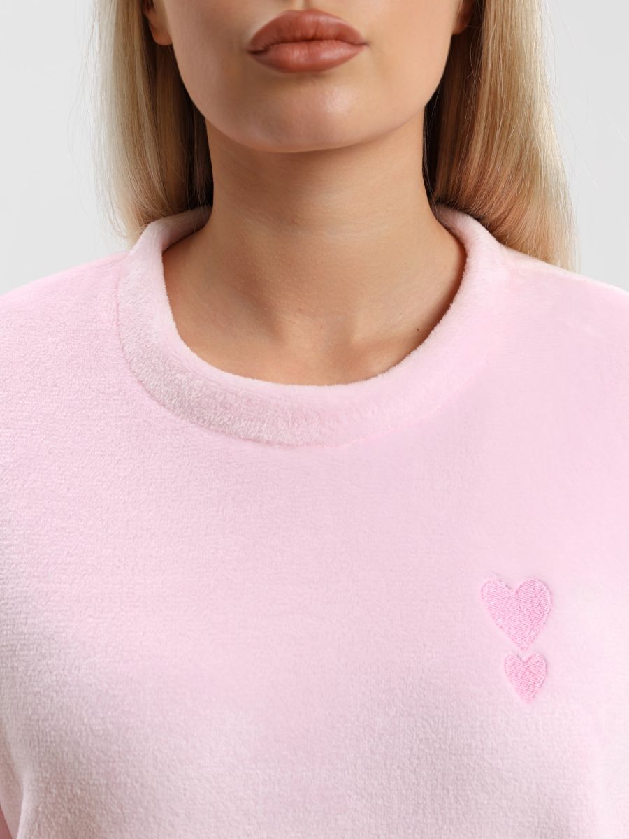 Костюм молодежный из трикотажного полотна «велсофт» в комбинации двух видов, состоящий из джемпера и брюк. Джемпер – из гладкого полотна, свободного покроя, с длинными втачными рукавами, нижние срезы которых обработаны эластичной тесьмой,и горловиной овальной формы, обработанной втачной планкой. С левой стороны на полочке вышивка.Брюки - из полотна со стриженым узором «сердечки», без карманов, с эластичной тесьмой по талии и нижним срезам.