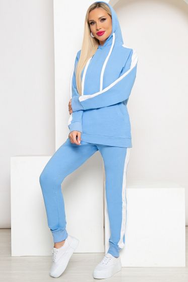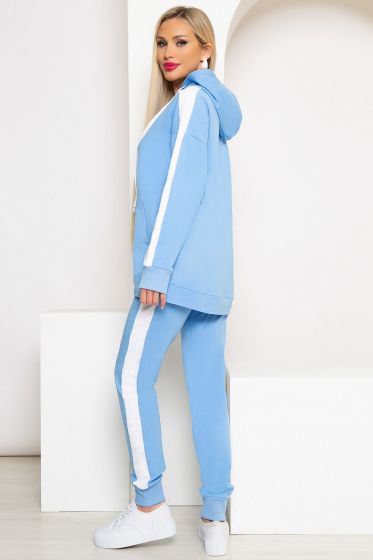 Спортивный костюм из трикотажного полотна состоит из худи и брюк. Брюки имеют комфортную посадку на талии, которую обеспечивает пояс на резинке. По бокам функциональные карманы. Низ на манжетах. Худи прямого кроя. Втачной рукав со спущенным плечом оканчивается притачной манжетой. Модель с капюшоном. Низ ровный, без разрезов. Комплект оформлен контрастными лацканами белого цвета по боковым швам брюк и рукавам.