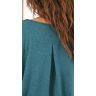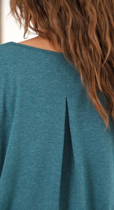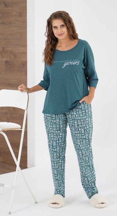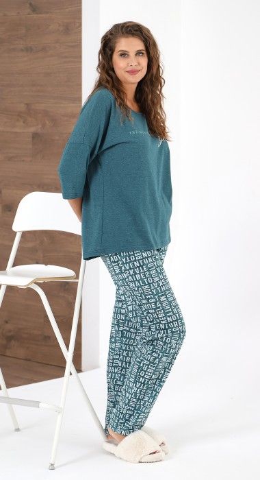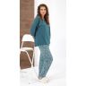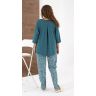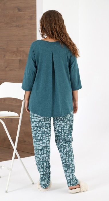 Костюм женский из трикотажного полотна «кулирка» в комбинации двух видов: меланжированного гладкокрашеного и с набивным рисунком, состоящий из футболки и брюк. Футболка – из гладкокрашеного меланжированного полотна, свободного, покроя, удлиненная, с рукавами ¾ длины на основе цельнокроеных, горловиной овальной формы, окантованной основным материалом, фигурной линией низа и принтом на полочке, выполненным в технике шелкографии. Спинка – со встречной складкой по центру детали. Брюки – из полотна с набивным рисунком, длинные, слегка зауженные книзу, с эластичной тесьмой по талии и карманами в боковых швах.