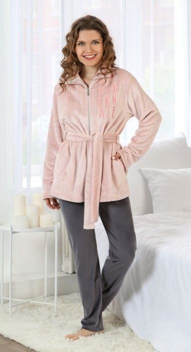 Костюм из двух видов текстильных материалов: тканого полотна «велсофт» и трикотажного полотна «вельмонд», состоящий из куртки и брюк. Куртка – из полотна «велсофт», с длинными втачными рукавами, воротником «стойка», карманами в боковых швах, вышивкой на верхней части полочки, центральной бортовой застежки на тесьму «молния». Съемный, завязывающийся на талии пояс, вдет в две шлевки, вставленные в боковые швы. Брюки – из трикотажного полотна «вельмонд», длинные, с эластичной тесьмой по талии.