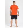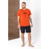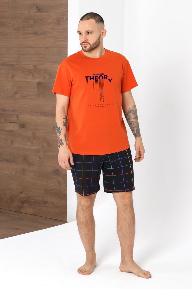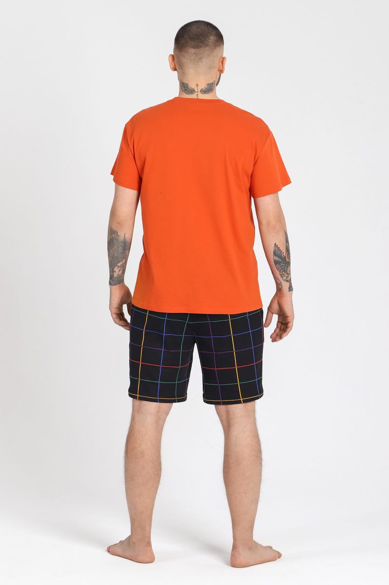 Костюм мужской из хлопчатобумажных трикотажных полотен кулирного переплетения. Однотонная футболка со слегка спущенной линией плеч, округлым вырезом горловины, с принтом. Шорты из полотна с набивным рисунком эксклюзивного дизайна, с боковыми карманами, на притачном поясе из рибаны с отстроченной эластичной тесьмой.