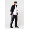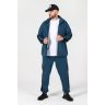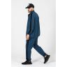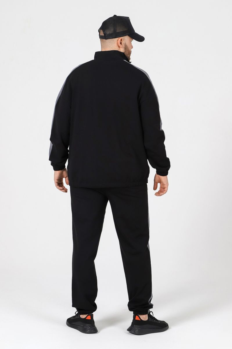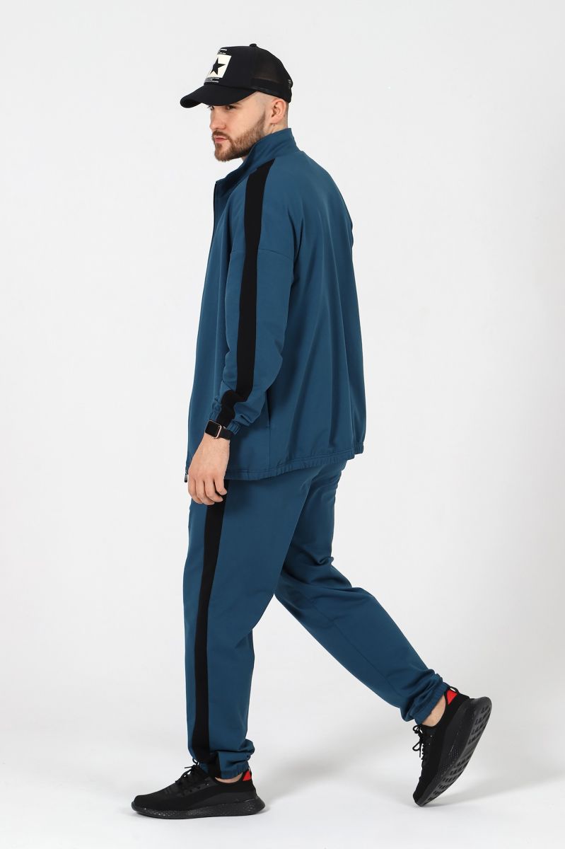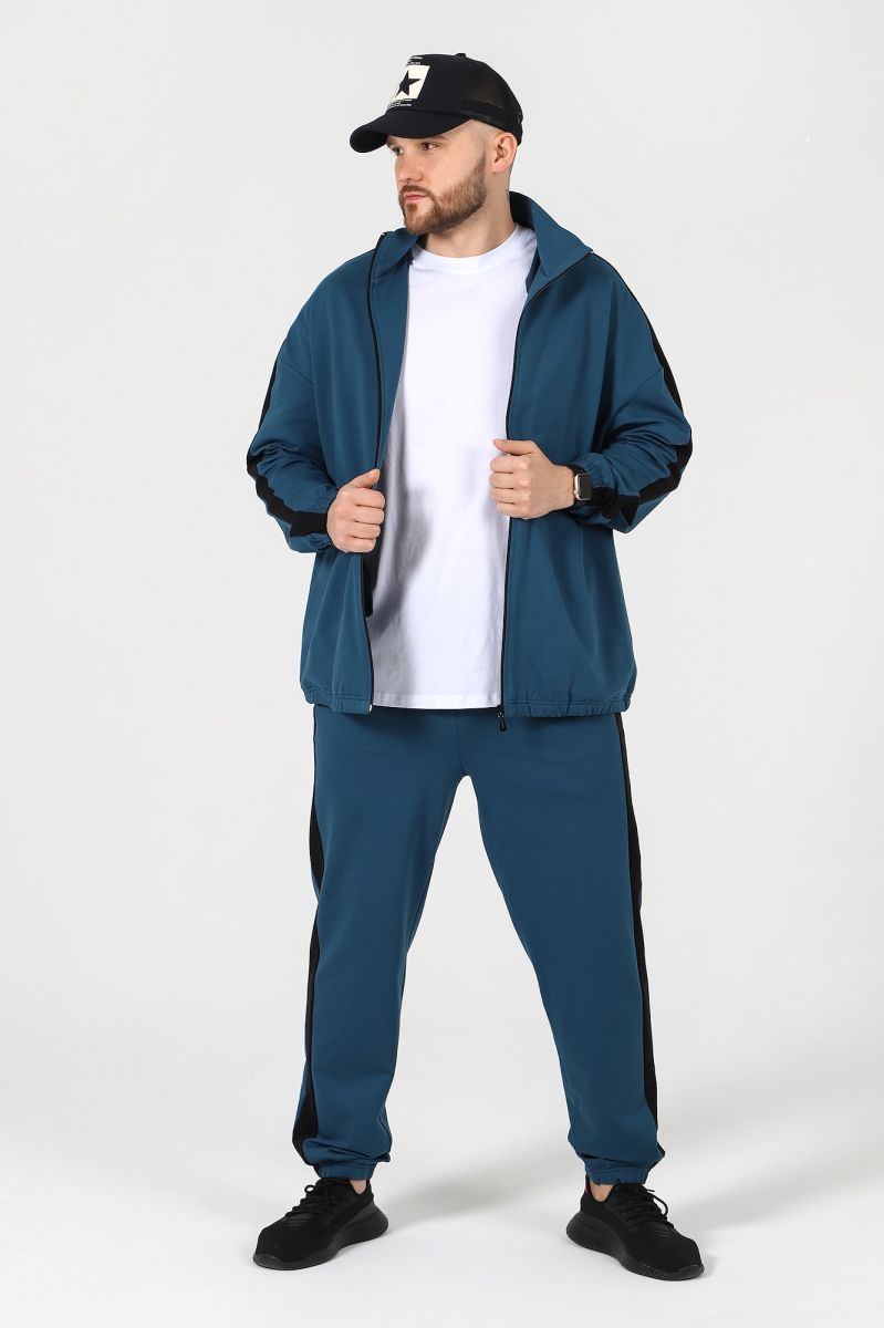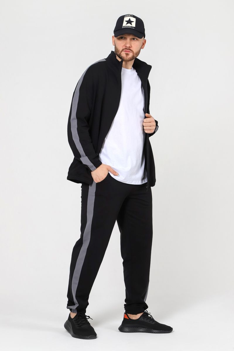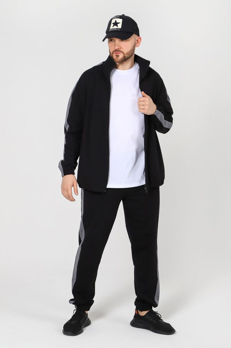 Костюм мужской из приятного к телу и комфортного в эксплуотации хлопкового футера с добавлением лайкры. Джемпер с воротником-стойкой, со спущенной линией плеч, с застежкой на разъемную молнию, закрытую с изнаночной стороны подбортом, с карманами в боковых швах. Брюки с боковыми карманами, отрезным поясом с отстроченной эластичной тесьмой и внутренним шнуром для регулировки свободы прилегания по линии талии. По низу джемпер, рукава и брючины собраны на эластичную тесьму. По линии плеч, центру рукавов и по боковым линиям брюк - контрастные втавки.