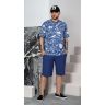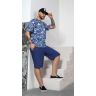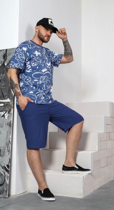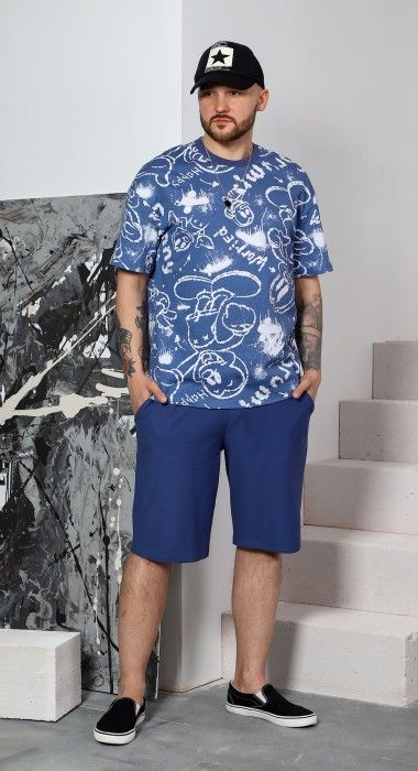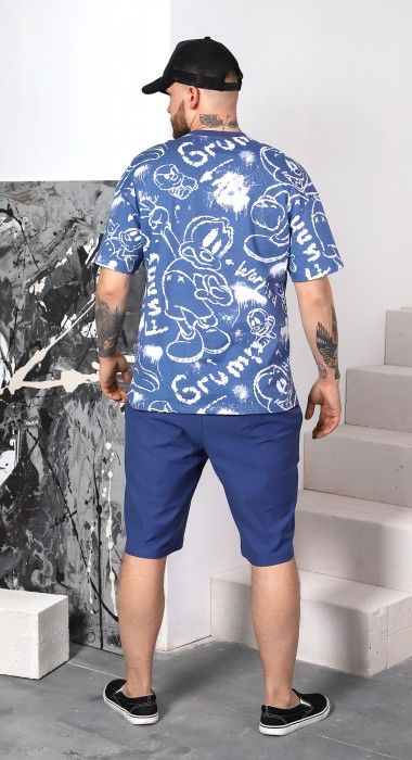Футболка со слегка спущенной линией плеч, выполненная из хлопкового трикотажного полотна кулирного переплетения с набивным рисунком эксклюзивного дизайна, деталь горловины - из кашкорсе. Шорты из однотоного хлопкового полотна, с боковыми карманами, на притачном поясе с отстроченной эластичной тесьмой. В нашем ассортименте представлен аналогичный костюм для мальчика.