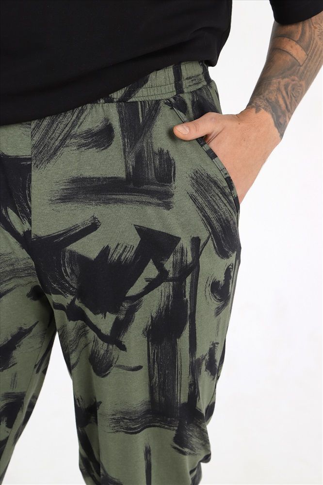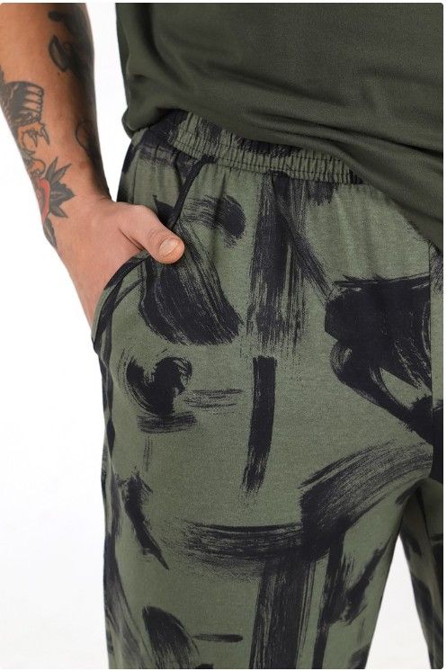 Брюки - из полотна с набивным рисунком, длинные, на притачном поясе с эластичной тесьмой внутрии и карманами с окантованными входами в боковых швах.