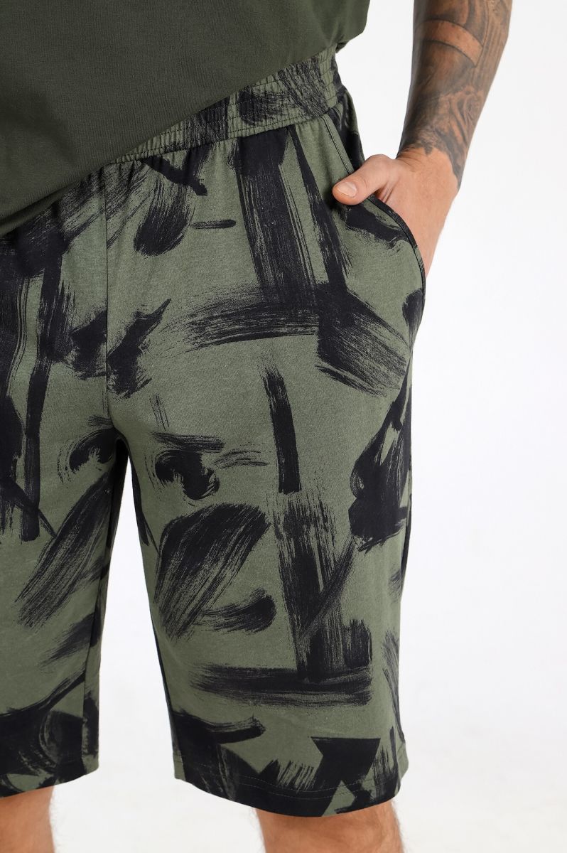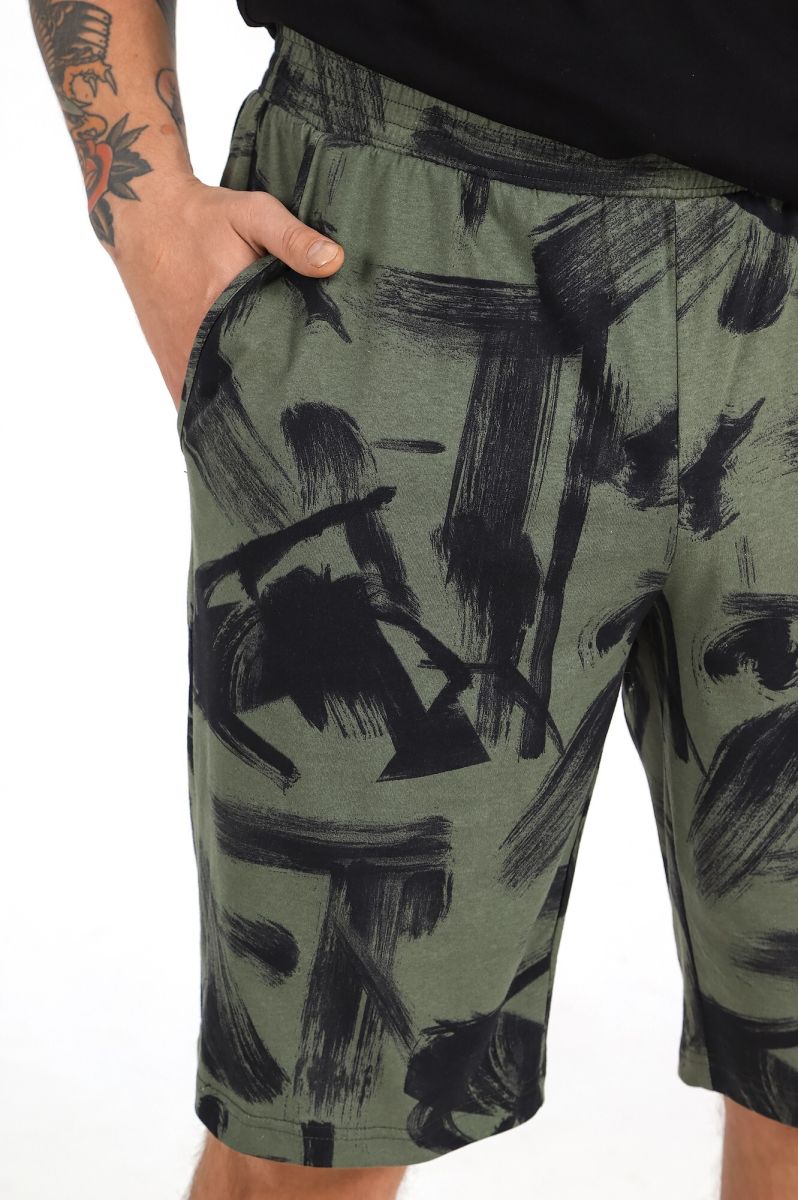 Шорты - из полотна с набивным рисунком, удлиненные, на притачном поясе с эластичной тесьмой внутриии карманами с окантованными входами в боковых швах.