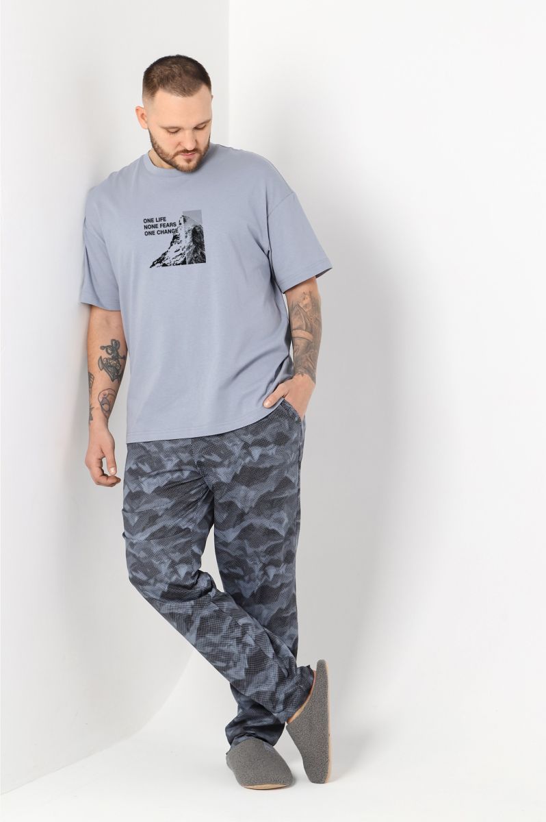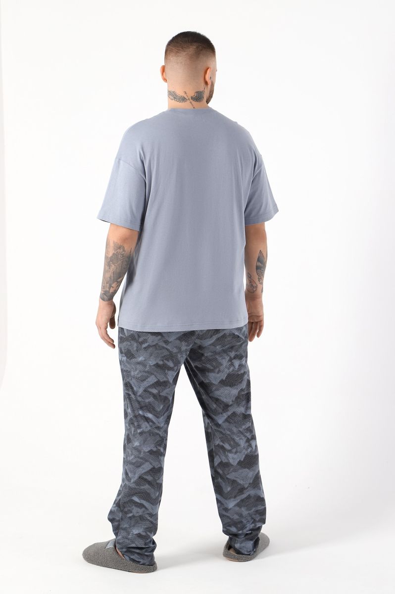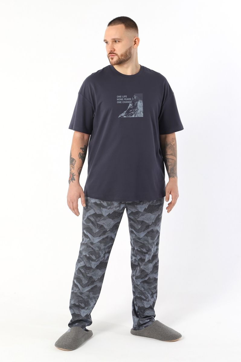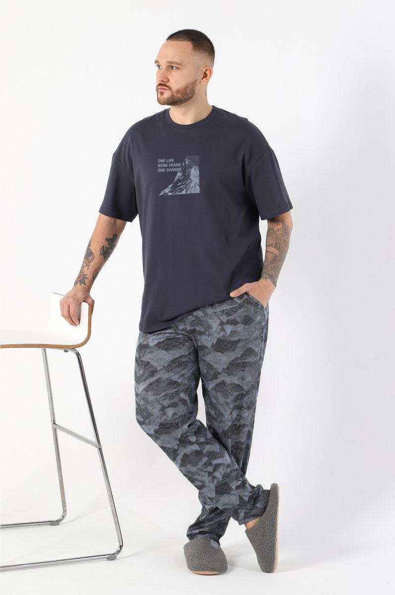 Футболка - из гладкокрашеного полотна, свободного покроя, со спущенным плечом, короткими втачными рукавами, горловиной овальной формы, обработанной втачной планкой, и принтом в центре переда. По шву втачивания планки настрочена двойная отделочная строчка. Брюки - из полотна с набивным рисунком, на притачном поясе с эластичной тесьмой внутри, с карманами в боковых швах. Входы в карманы окантованы основным материалом.