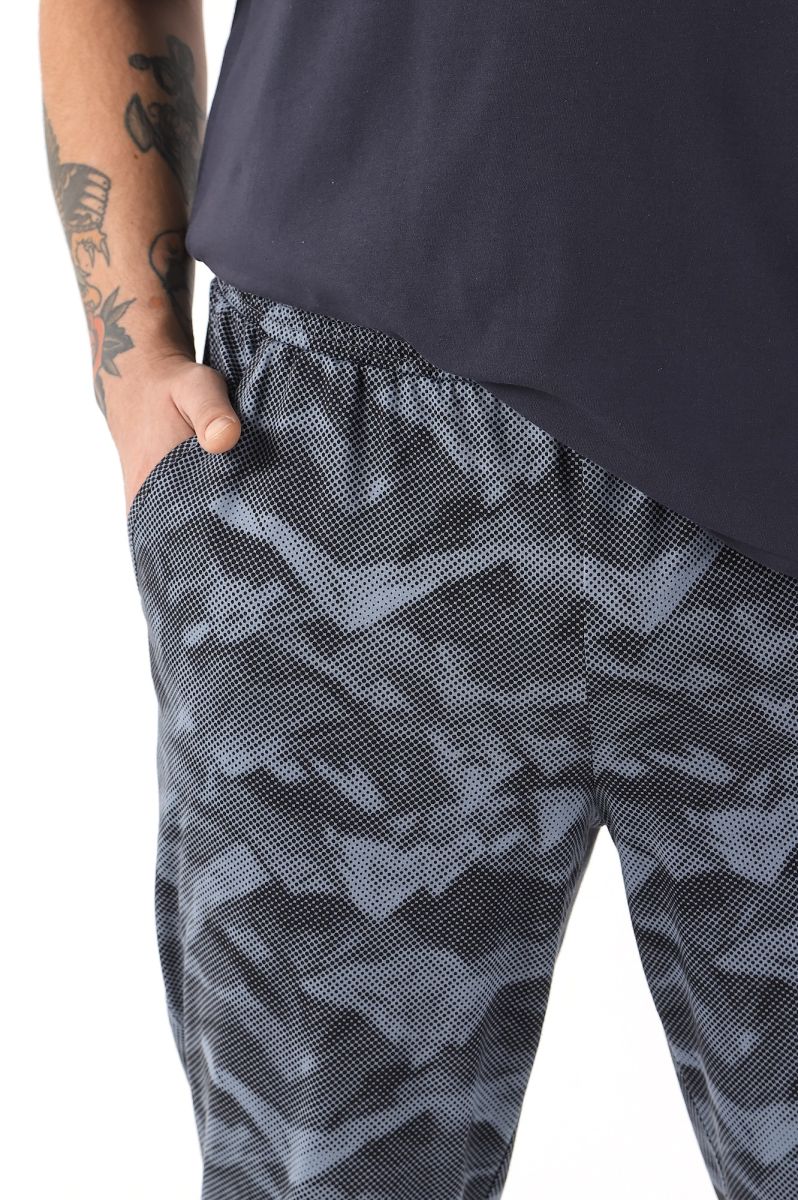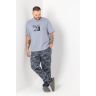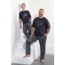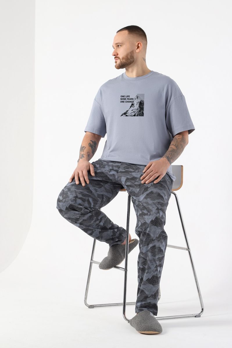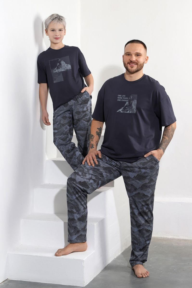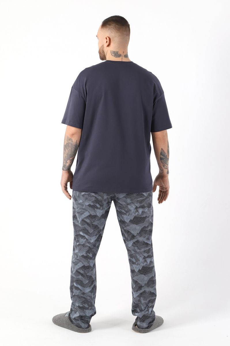 Футболка - из гладкокрашеного полотна, свободного покроя, со спущенным плечом, короткими втачными рукавами, горловиной овальной формы, обработанной втачной планкой, и принтом в центре переда. По шву втачивания планки настрочена двойная отделочная строчка. Брюки - из полотна с набивным рисунком, на притачном поясе с эластичной тесьмой внутри, с карманами в боковых швах. Входы в карманы окантованы основным материалом.