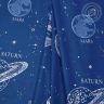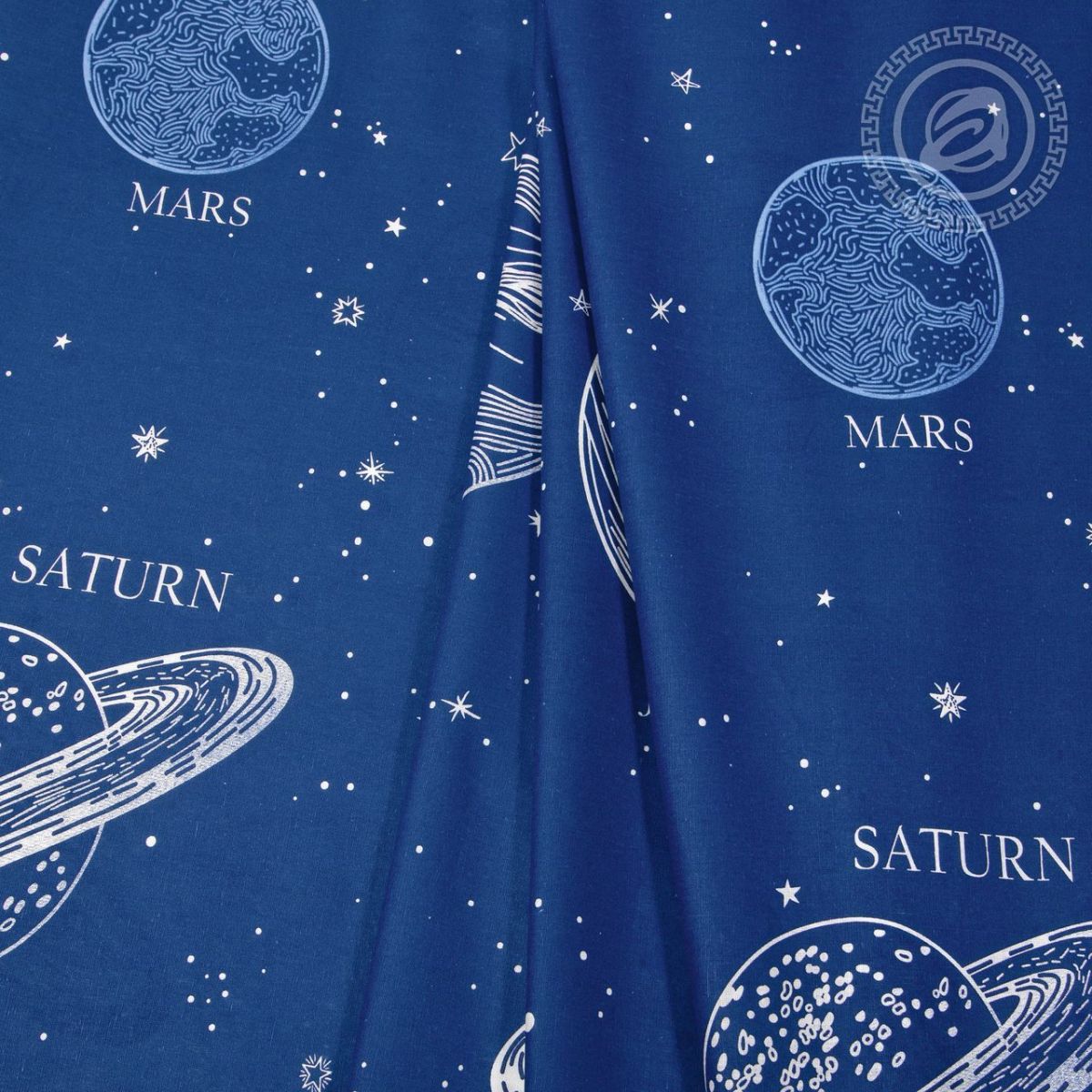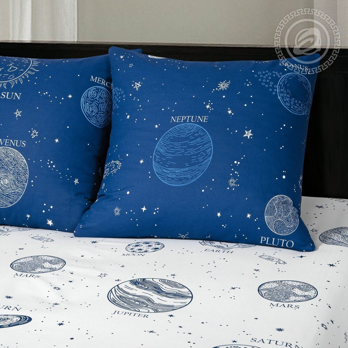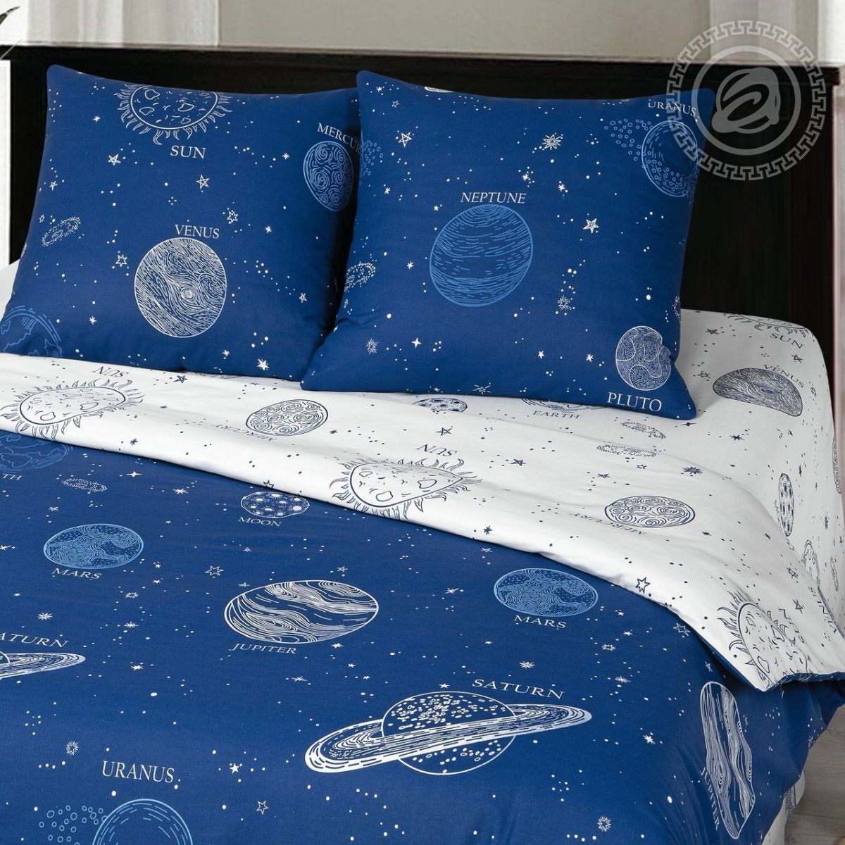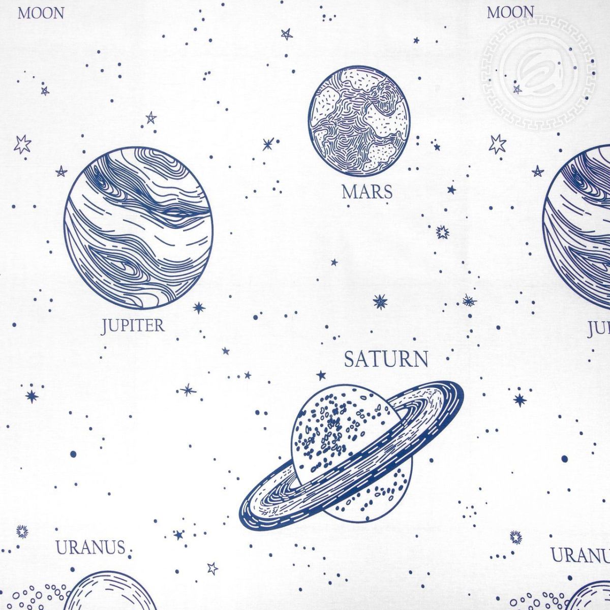 Постельное белье «Гравитация» из бязи с тематическим дизайном отражает красоту и загадочность космоса. На рисунке изображены планеты, Солнце и Луна. Каждая планета имеет свою надпись и находится в окружении бесчисленных звезд, сияющих на темно-синем небосводе.