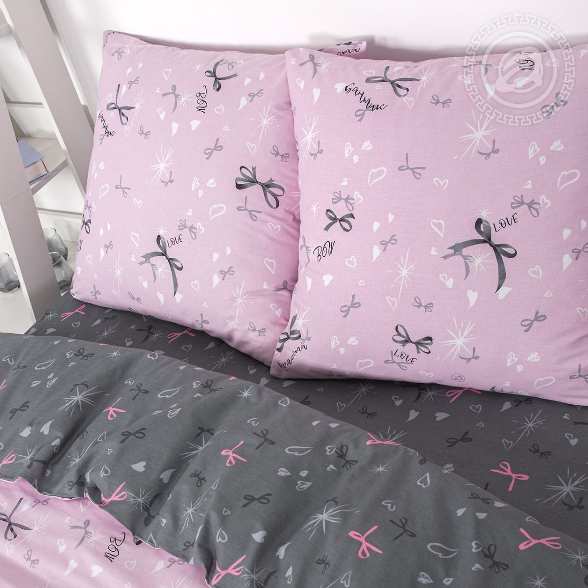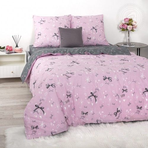 «Флирт» – постельное белье с бантиками с атмосферой романтики и нежности. Удачное сочетание розово-серых оттенков, лаконичный и очаровательный узор, – всё это делает комплект из поплина хитом коллекции.