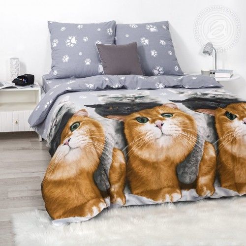 Усатые-полосатые – главные звезды комплекта из поплина «Пушистый патруль». Нежные цвета постельного белья с котами гармонично сочетаются с рисунками домашних любимцев и пушистых лапок. Забавный дизайн вызывает умиление. Это чудесный акцент в облике и спальне и тренд этого сезона. Очаровательные котики принесут удивительные сны!