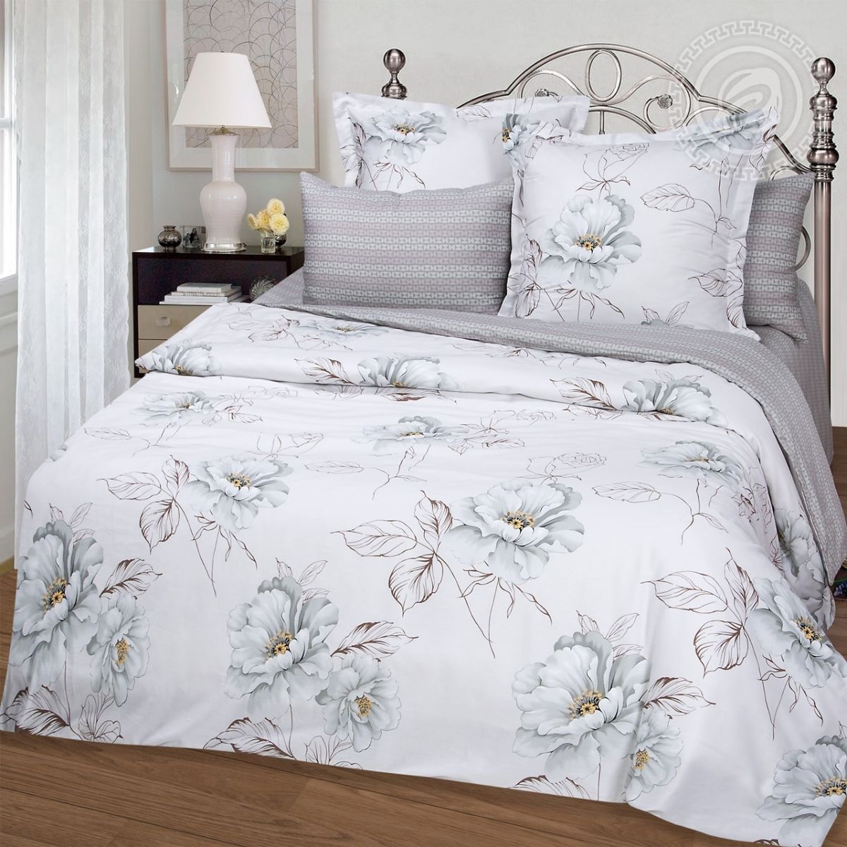 Комплект постельного белья «Мадемуазель» наполнит комнату светом и простором. Стильная модель выполнена в светлых тонах. По всей поверхности располагаются рисунки белых цветов с листочками. Они делают композицию нежной, загадочной и привлекательной. С таким постельным бельем каждая женщина будет чувствовать себя уверенной и женственной. Качественный отдых повлияет на хорошее самочувствие в течение всего дня.