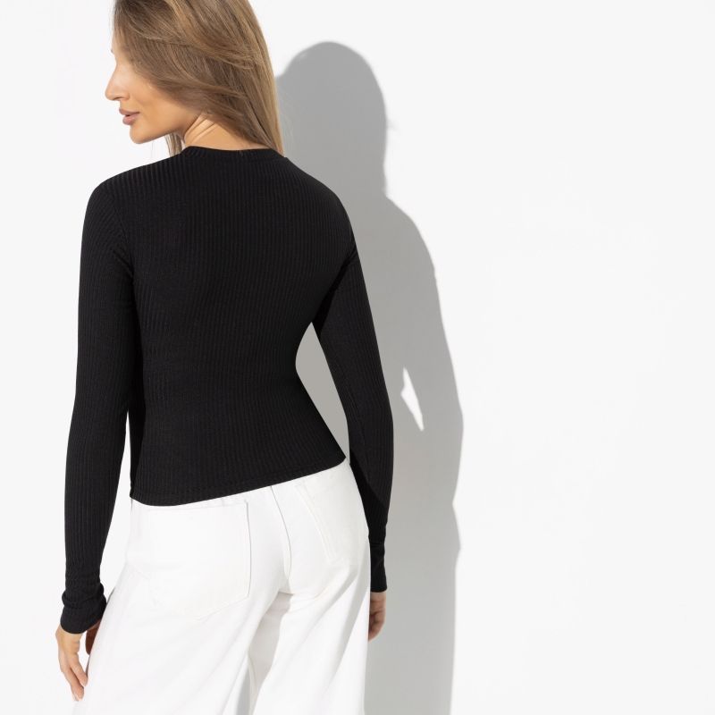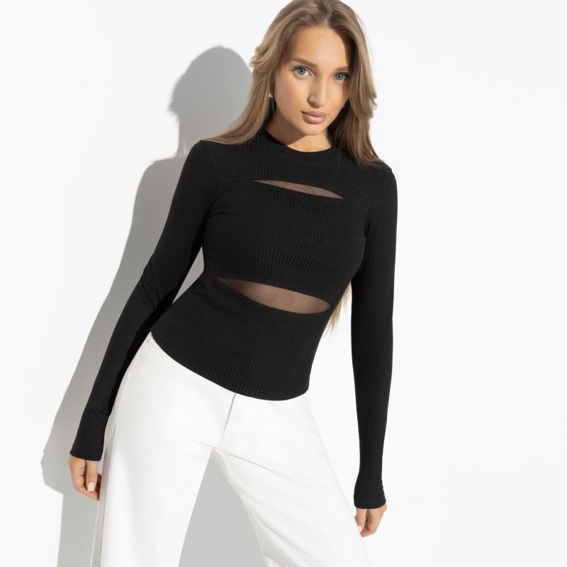 Тренд на прозрачность в самом элегантном воплощении. Лонгслив в цвете темной ночи с деликатными элементами из сетки. Хорош со всех сторон.