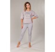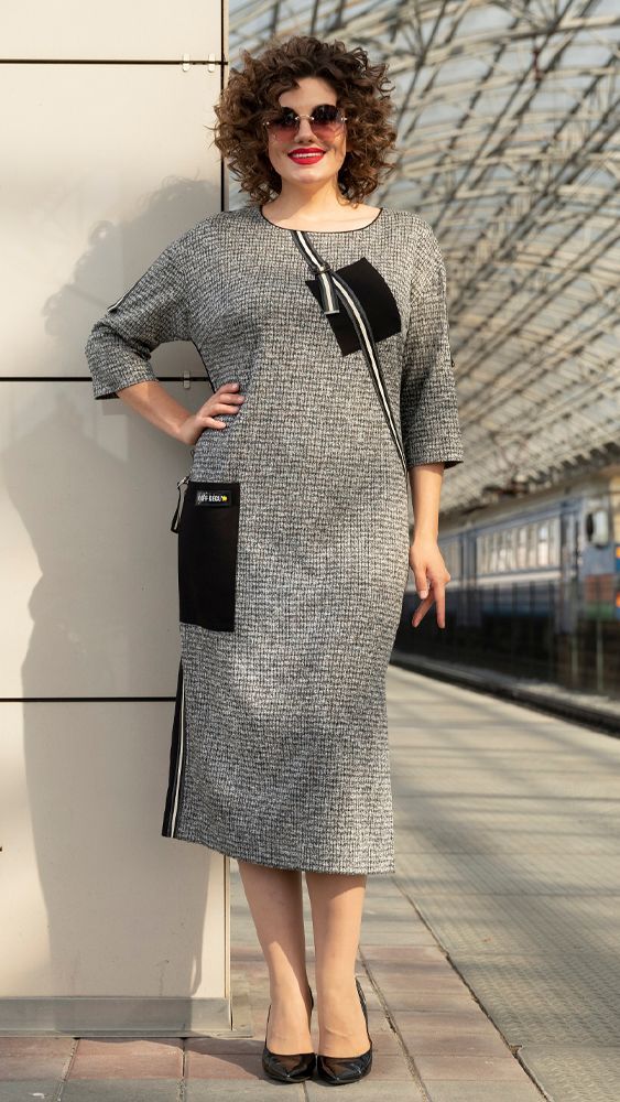 Трикотаж плотный, но эластичный. В боковом шве разрез, на переде накладные карманы.