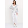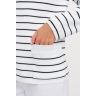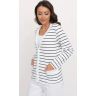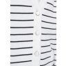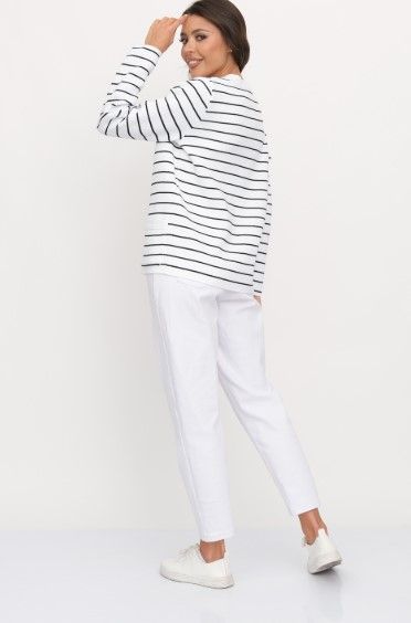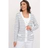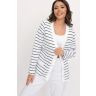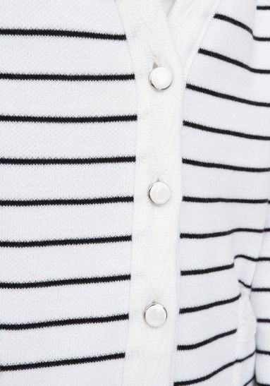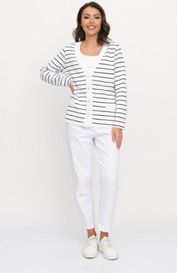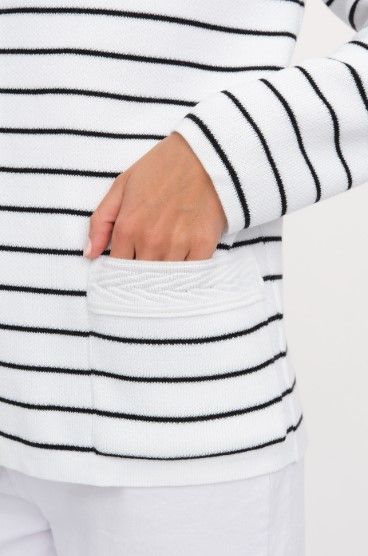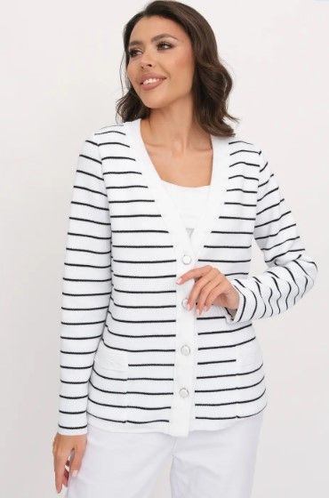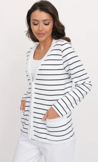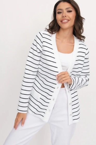 Молодежный жакет свободного силуэта в тонкую горизонтальную полоску контрастного черного цвета. Ворот изделия, передняя планка и края карманов отделаны однотонной белой бейкой.
