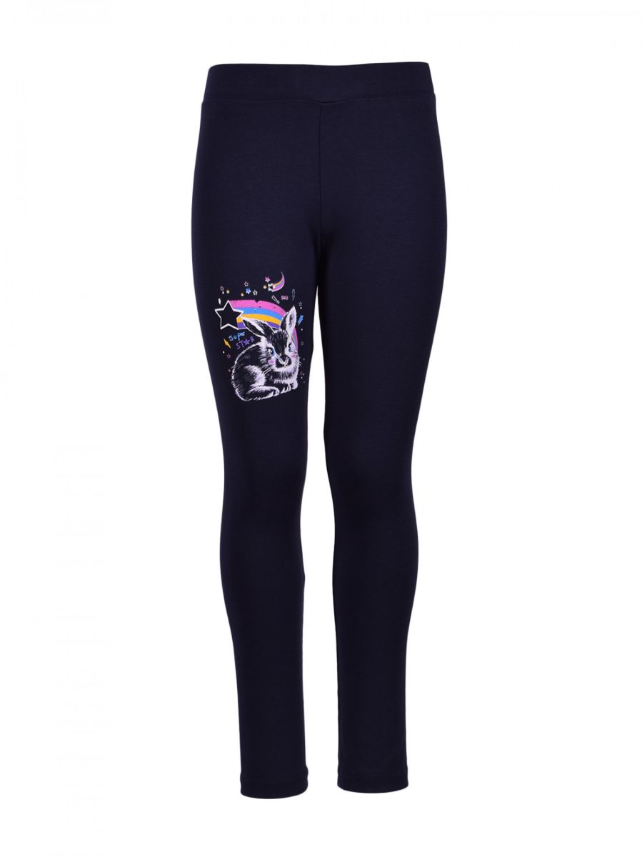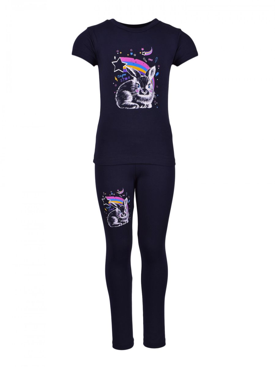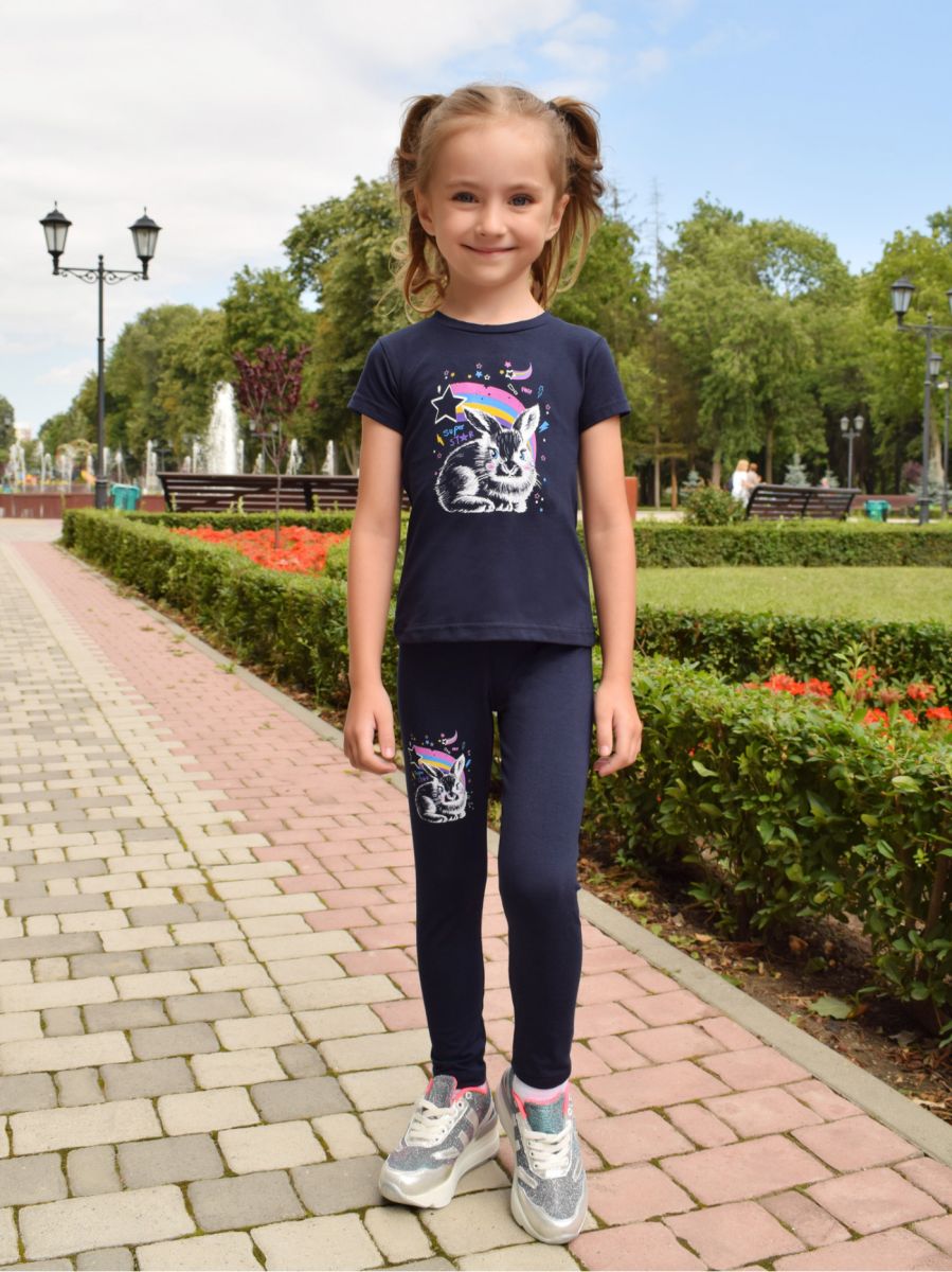 Модный костюм для девочки из стрейча. Лонгслив прямого покроя, с длинными втачными рукавами и округлым вырезом горловины. Полочка украшена принтом . Лосины удобные, так как благодаря стрейчевой ниточке они тянутся и не сковывают движения. По талии эластичная резинка. Костюм в темно-синей расцветке, станет отличным вариантом для повседневного гардероба маленькой модницы.