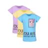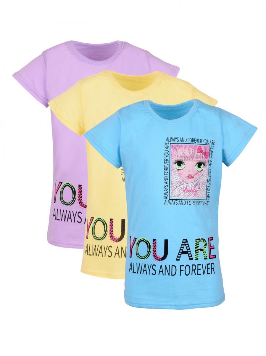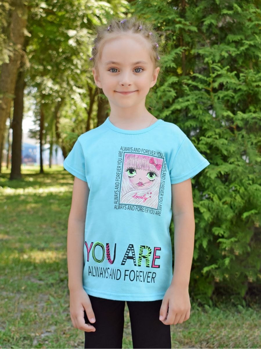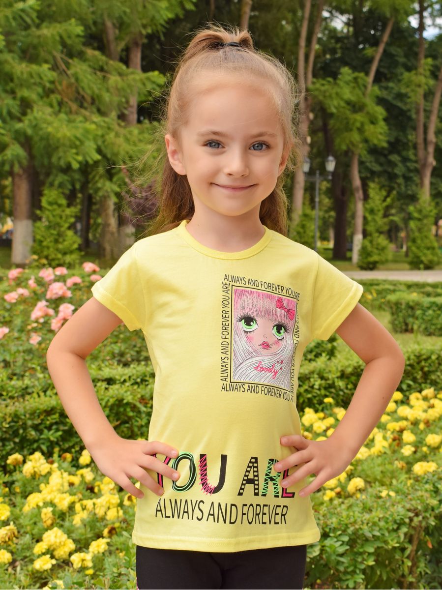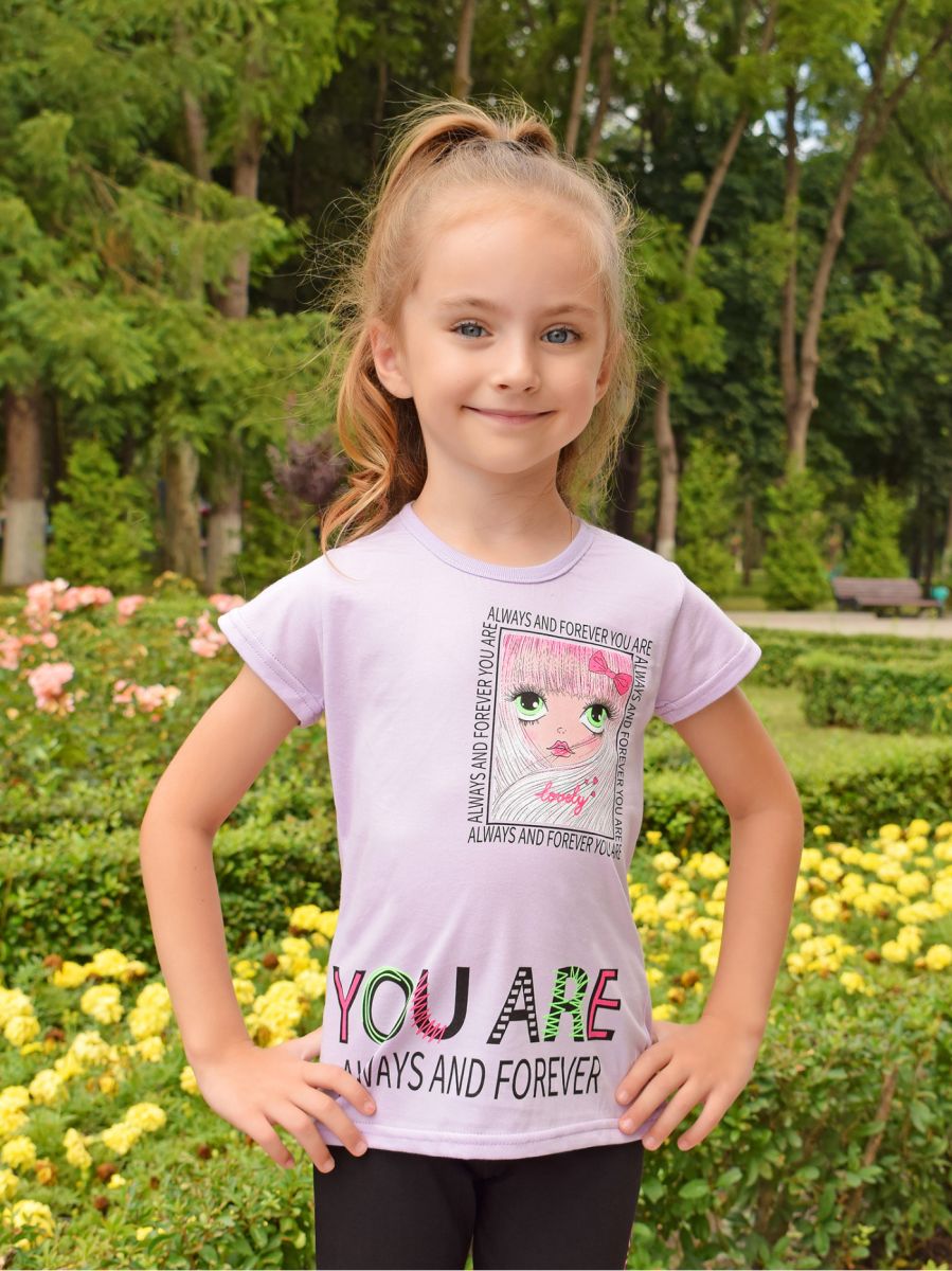 Стильная футболка для девочки выполнена из легкого хлопкового полотна супрем, представлена модель в 3-х ярких расцветках. Изделие с короткими рукавами, украшено дизайнерским принтом. Отличный вариант повседневного гардероба для ребенка.