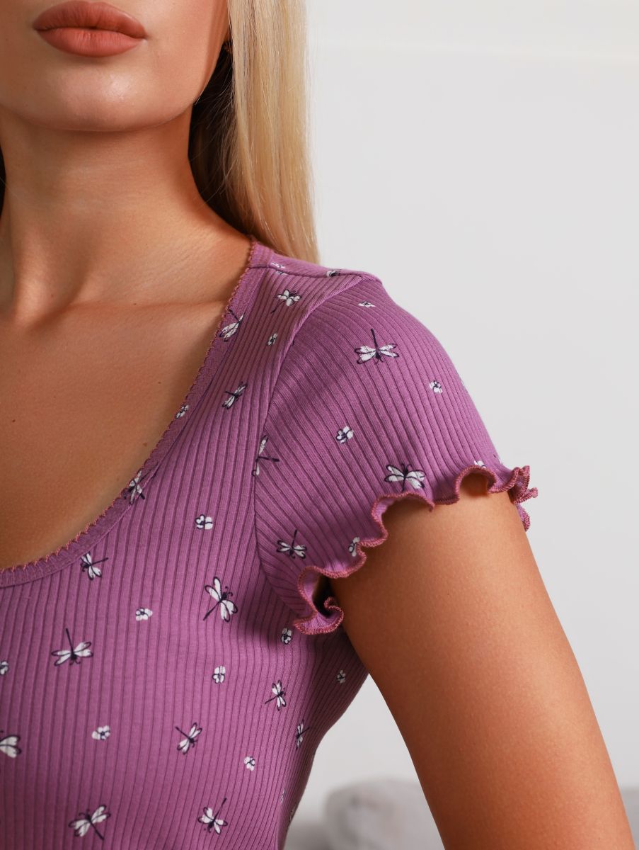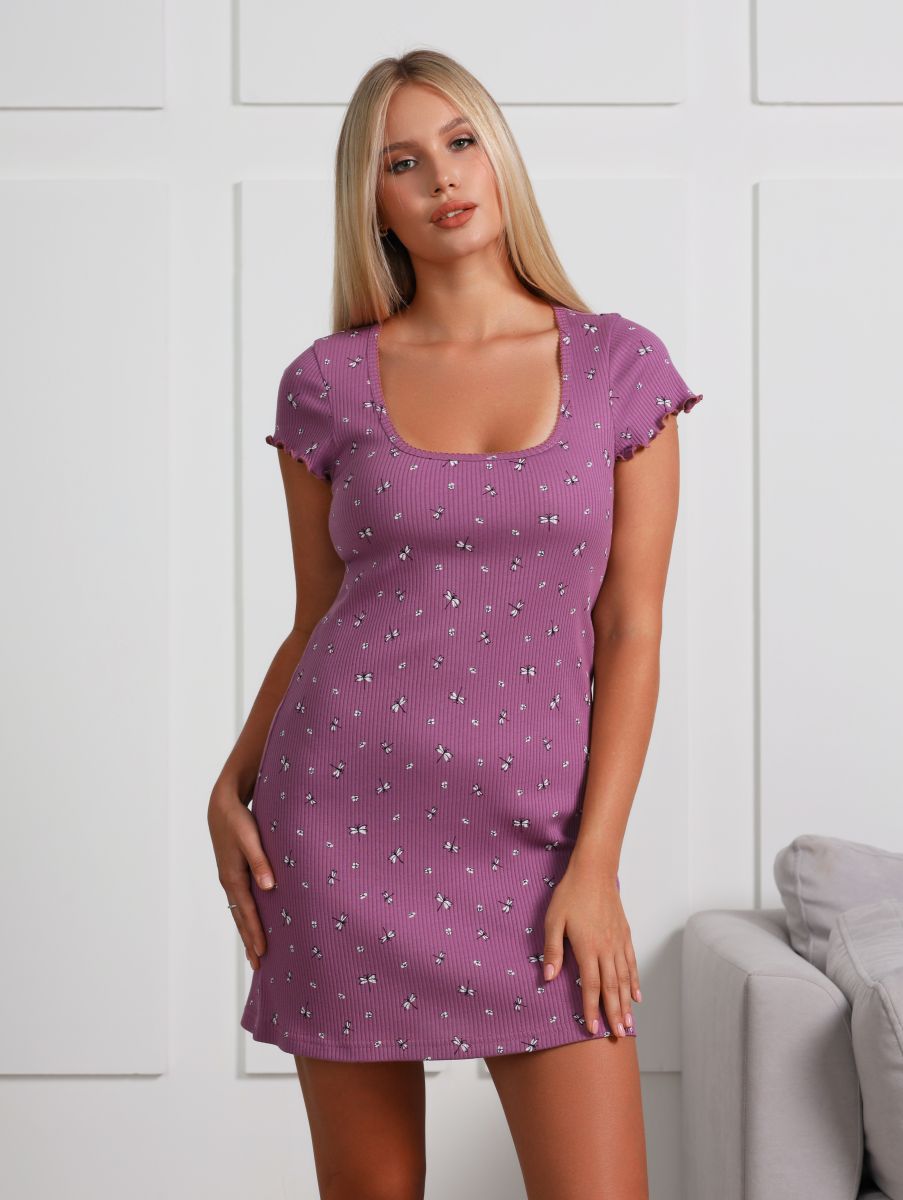 Сорочка молодежная из трикотажного полотна «кашкорсе» с набивным рисунком, слегка расширенная книзу, с короткими втачными рукавами, углубленной формой горловины, окантованной основным материалом и украшенной декоративной строчкой «кроше». Низ изделия и нижние срезы рукавов обработаны узкой обметочной строчкой, создающей красивый волнистый край.