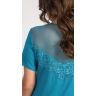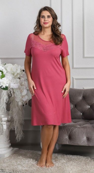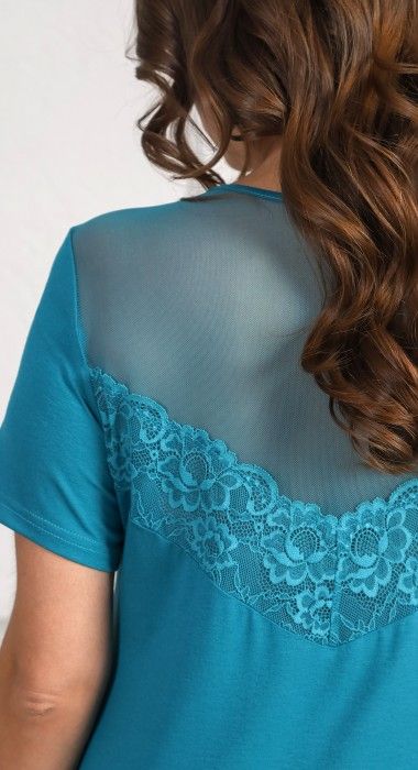 Сорочка из гладкокрашеного трикотажного вискозного полотна, слегка расширенная книзу, с короткими втачными рукавами и горловиной овальной формы, окантованной основным материалом. На полочке и спинке – притачные кокетки v-образной формы, выполненные из полотна «сетка», с настроченными на них кружевными деталями.