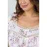 Из трикотажного полотна «кулирка» с набивным рисунком, свободного покроя, расширенная книзу, с короткими втачными рукавами и горловиной фигурной формы. Полочка – с притачной кокеткой V-образной формы, состоящей из двух частей. Нижняя, основная деталь полочки присборена по шву стачивания с кокеткой. Низ рукавов, горловина и кокетка отделаны кружевом. В центре кокетки – два декоративных бантика из узкой атласной ленты.