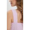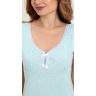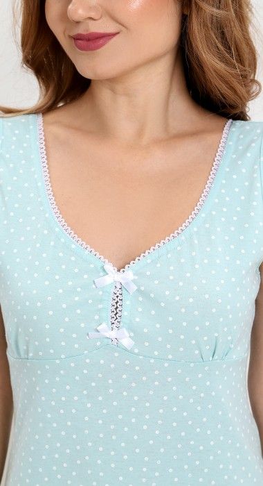 Из трикотажного полотна «кулирка» с набивным рисунком в мелкий горох, расширенная книзу, без рукавов. Перед – с отрезной ниже груди кокеткой, присборенной по шву притачивания к основной детали. Углубленная горловина в центре переходит в разрез. Спинка – с прямолинейным верхним срезом и двумя широкими бретелями, соединенными с кокетками переда по плечевым швам. Верхний срез спинки, проймы и наружные срезы бретелей окантованы основным материалом. Горловина, разрез спереди и срезы бретелей, обращенные к центру спинки, обработаны эластичной тесьмой с ажурным краем. Низ изделия обработан узкой обметочной строчкой, создающей красивый волнистый край.