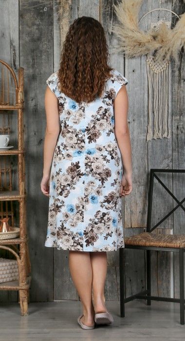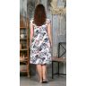 Сорочка из трикотажного полотна «кулирка» с набивным цветочным рисунком, расширенная книзу, свободного покроя, без рукавов, с углубленной и расширенной горловиной овальной формы, с двумя кокетками, переходящими со спинки на полочки. Горловина и проймы окантованы основным материалом. По швам стачивания кокеток с передом и центру горловины выполнена сборка. Швы стачивания кокеток с передом отделаны кружевом.
