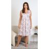 Сорочка женская из трикотажного полотна «кулирка» с набивным рисунком, расширенная книзу, без рукавов, с углубленной горловиной овальной формы. В центре переда – встречная складка, выходящая из центра горловины и застроченная на 10 см. Горловина и проймы окантованы основным материалом и дополнительно отделаны декоративной строчкой «кроше» нитками контрастного цвета. Низ изделия обработан узкой обметочной строчкой нитками контрастного цвета. В центре горловины – декоративный бантик из узкой атласной ленты.