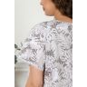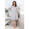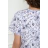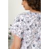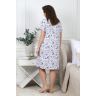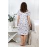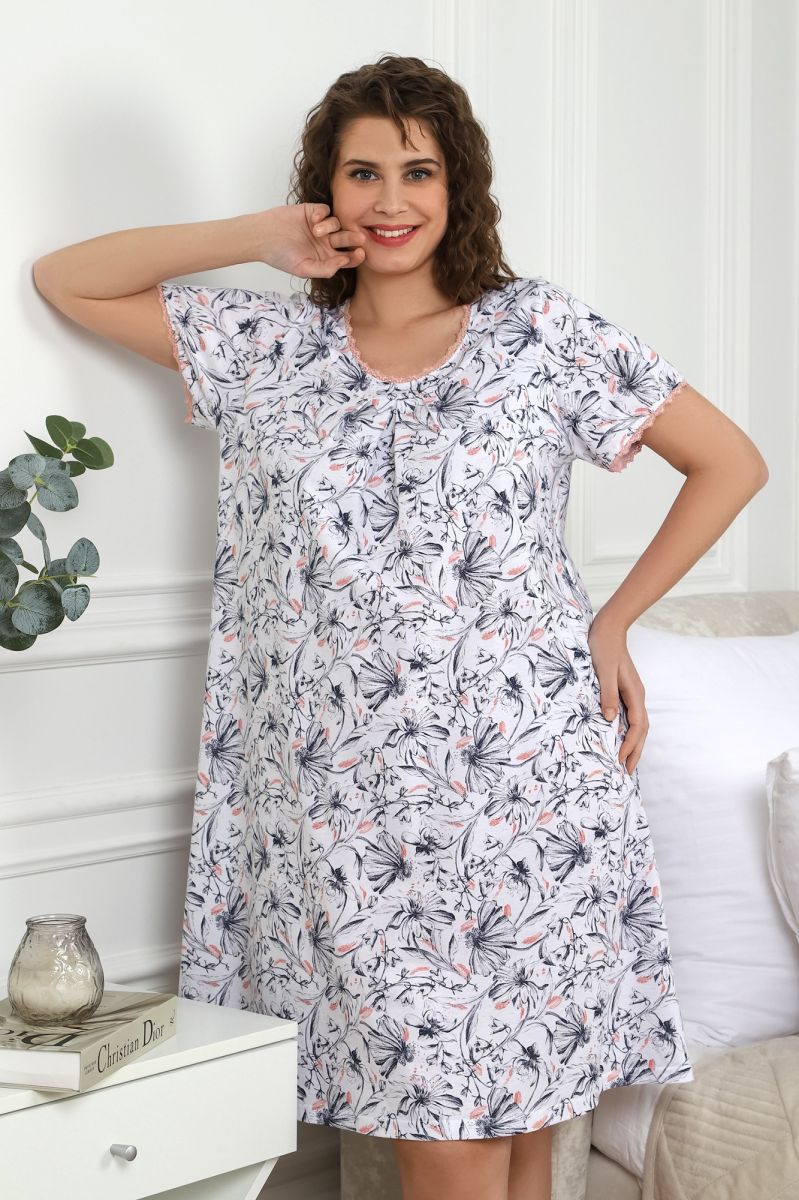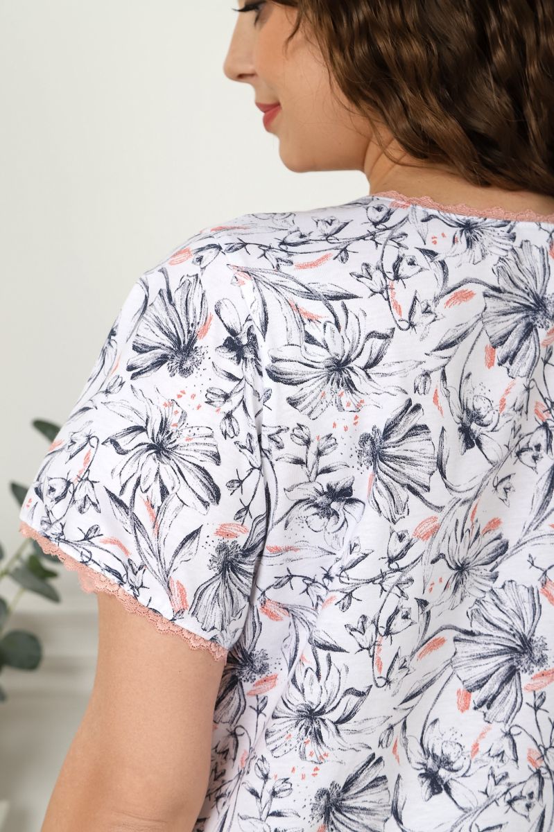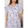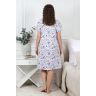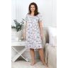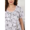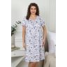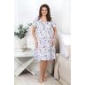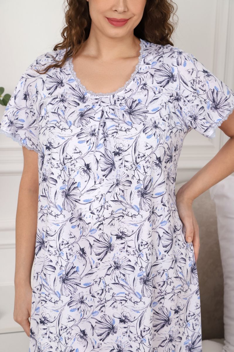 Сорочка женская из трикотажного полотна «кулирка» с набивным рисунком, свободного покроя, слегка расширенная книзу, с короткими втачными рукавами и горловиной овальной формы. Полочка – с отделочной деталью, повторяющей контур горловины, в шве притачивания которой симметрично относительно центра заложены 6 складочек-защипов. Наружный край горловины и низ рукавов обработаны узким кружевом.