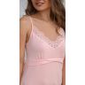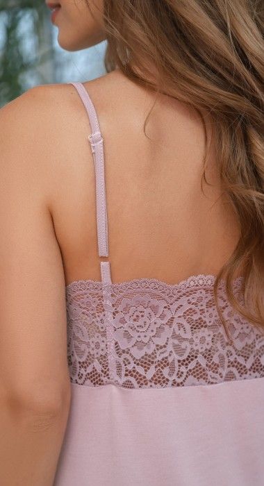 Сорочка молодежная из гладкокрашеного вискозного полотна, без рукавов, на узких бретелях из основого материала, расширенная книзу. Полочка – с отрезной кокеткой, присборенной по шву соединения с основной деталью и декоративной планкой отделана кружевом по V-образному вырезу.