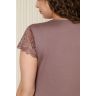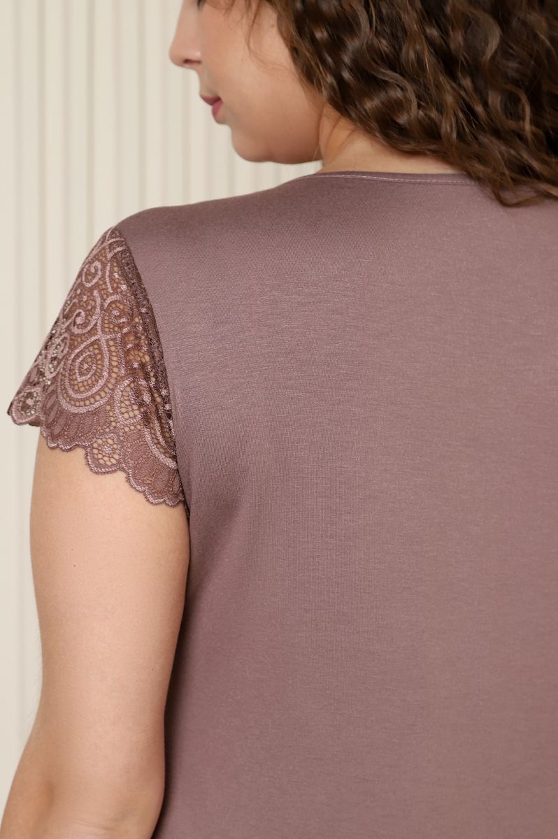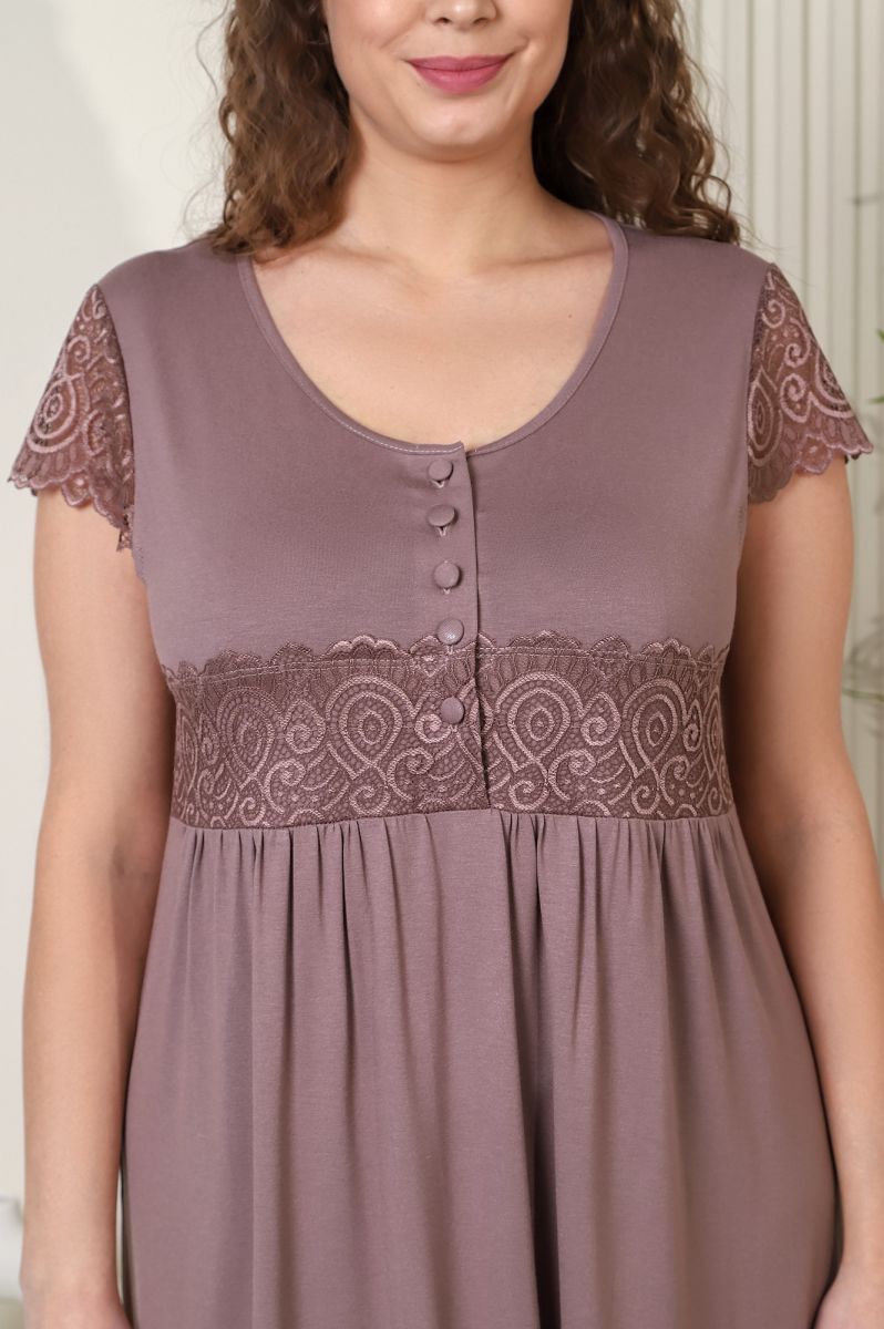 Сорочка женская из гладкокрашенного вискозного полотна, свободного покроя, отрезная по линии талии, с короткими втачными кружевными рукавами и горловиной овальной формы, окантованной основным материалом. Нижняя часть присборена по шву соединения с лифом, на полочке отделка кружевом, бортовая застежка на петли и пуговицы.