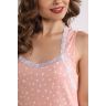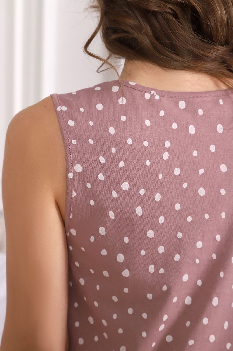Сорочка молодежная из трикотажного полотна «кулирка» с набивным рисунком, свободного покроя расширенная книзу, без рукавов. Горловина фигурной формы с двумя кокетками на полочке. Верхний срез лифа, образующий v-образный вырез и швы притачивания кокеток отделаны кружевом.